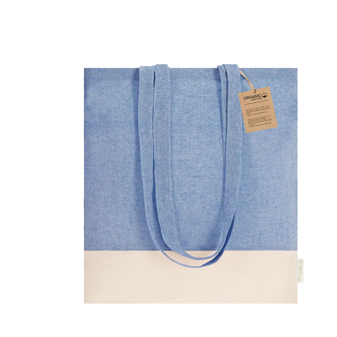 Bolsa en material 100% algodón reciclado de 120 g/m2. Asas largas de 70cm con refuerzo y de acabado cosido. Logotipo en etiqueta lateral y resistencia hasta 8 kg de peso. Disponible en variada gama de colores nature con base de color natural.