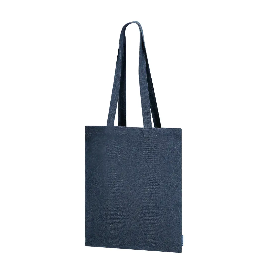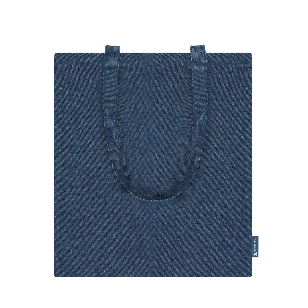 Bolsa confeccionada en tejido vaquero reciclado de 300 g/m2. Asas largas de 70cm con refuerzo, de acabado cosido. Logotipo de Denim Reciclado en etiqueta lateral y resistencia hasta 8 kg de peso.