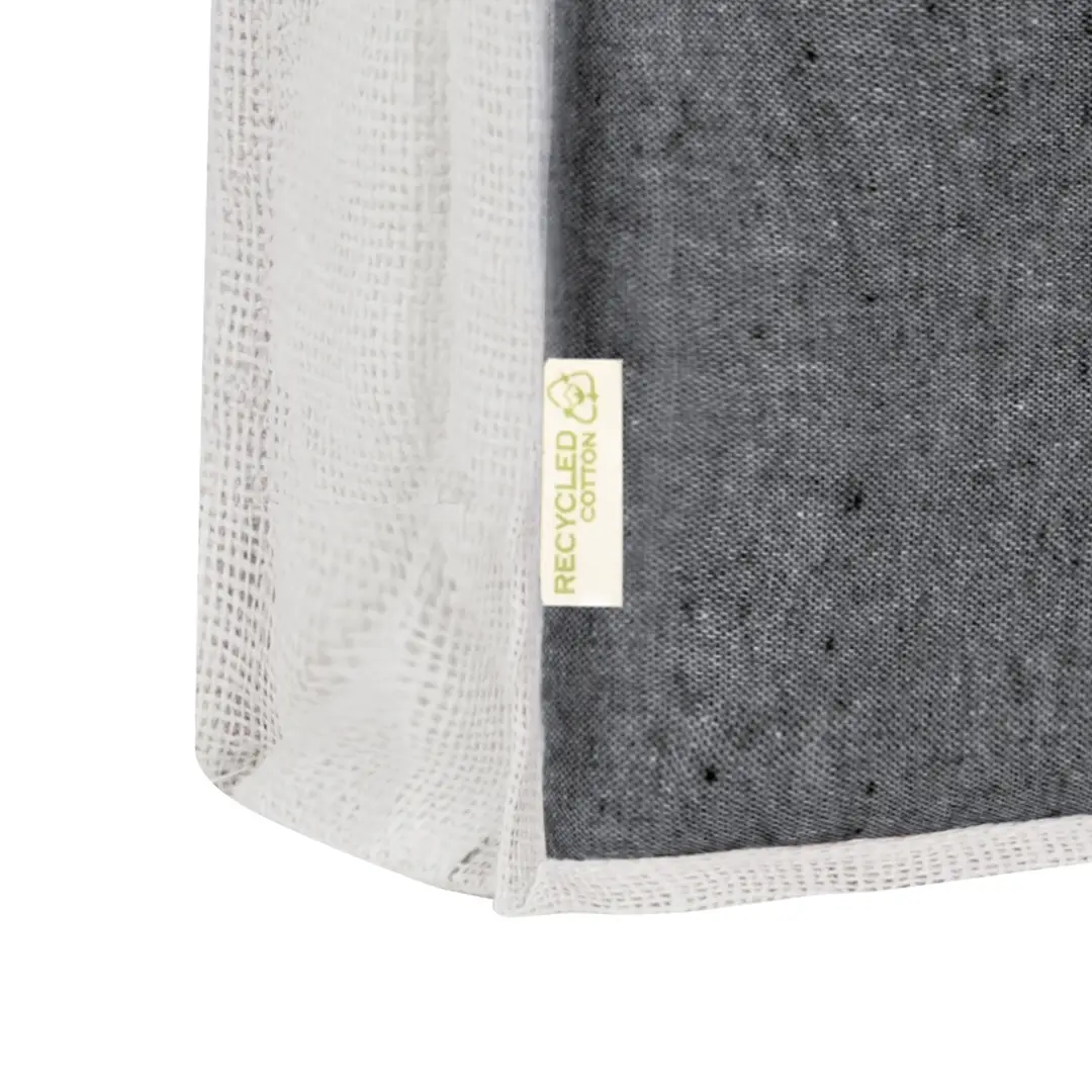 Bolsa en material 100% algodón reciclado de 140 g/m2 en combinación con el yute. Asas largas de 70cm con refuerzo, de acabado cosido y fuelle de yute. Logotipo en etiqueta lateral y resistencia hasta 8 kg de peso. Disponible en variada gama de colores nature con base de color natural.