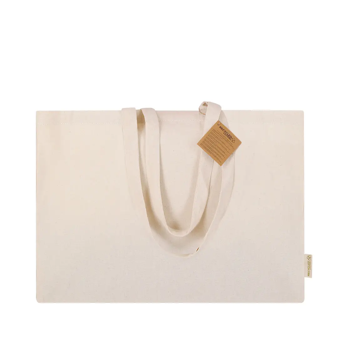 Bolsa con fuelle en base y laterales, confeccionada principalmente en algodón reciclado de 220g/m2. Cuenta con asas largas reforzadas de 70 x 2,5 cm. Incluye distintivo de Algodón Reciclado. Resistencia hasta 10 kg de peso.