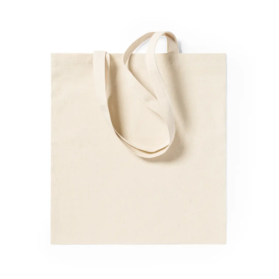 Bolsa en resistente material 100% algodón de 240g/m2 con acabado en color natural. Con asas largas reforzadas de 70cm y acabado cosido. Resistencia hasta 9kg de peso.