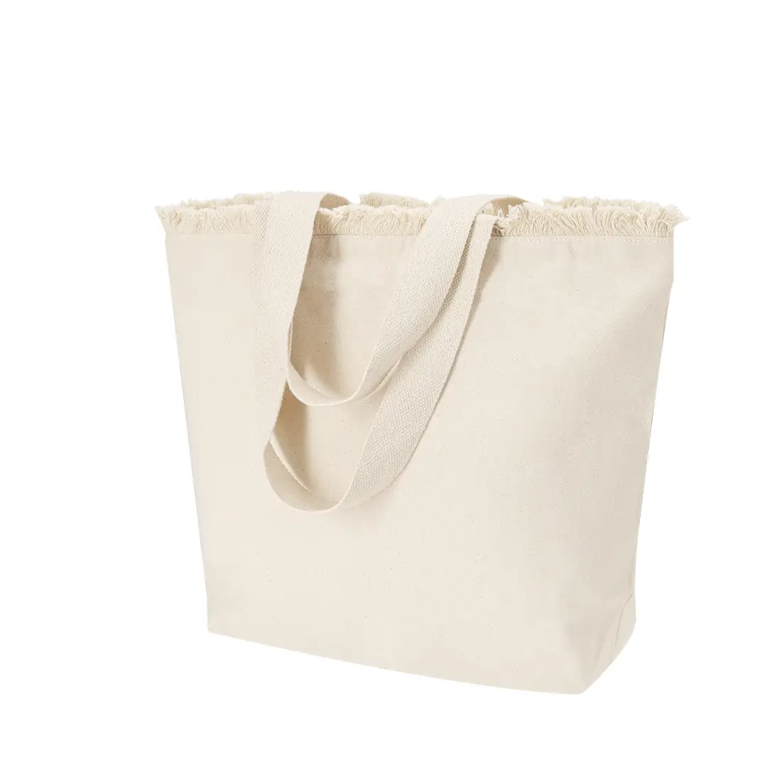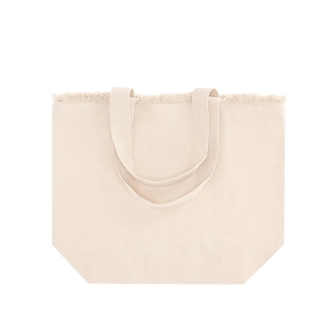 Bolsa con estilo flecos confeccionada principalmente en algodón de 320 g/m2. De práctico y moderno diseño, incorpora asas largas reforzadas. Incluye cierre de cremallera para mayor seguridad.