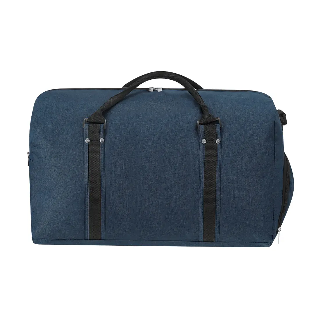 Bolso confeccionado en poliéster RPET 600D. Presenta tres compartimentos funcionales: un compartimento principal de gran capacidad con cierre de cremallera, un bolsillo lateral con cierre de cremallera y un bolsillo en la base con cierre de doble cremallera ideal para el calzado. Incluye asa larga ajustable, asas de mano reforzadas con tachuelas metálicas y con elegantes detalles en plateado. El material RPET se elabora a partir de plástico reciclado, para así fomentar la reutilización de residuos plásticos y ayudar a la sostenibilidad del planeta.
