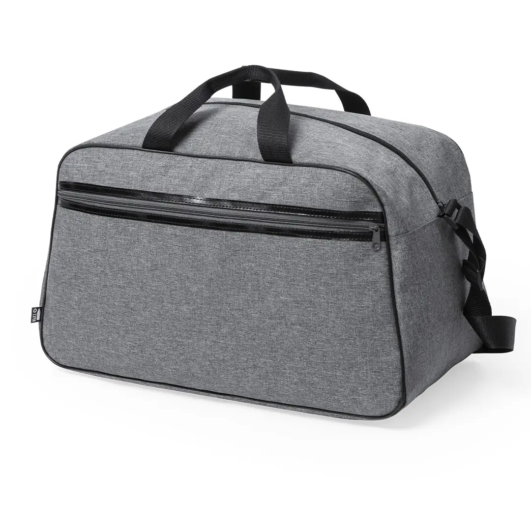 Bolso multiusos de línea nature en resistente 600D RPET efecto melange. Elaborado a partir de plástico reciclado para así fomentar la reutilización de residuos plásticos y contribuir a la sostenibilidad del planeta. De diseño urbano y con detalles en color negro, incluye 2 bolsillos de cremallera con tiradores metálicos e interiores forrados, reforzados en PVC. Asas de transporte reforzadas y cinta bandolera ajustable, con distintivo RPET en etiqueta exterior.