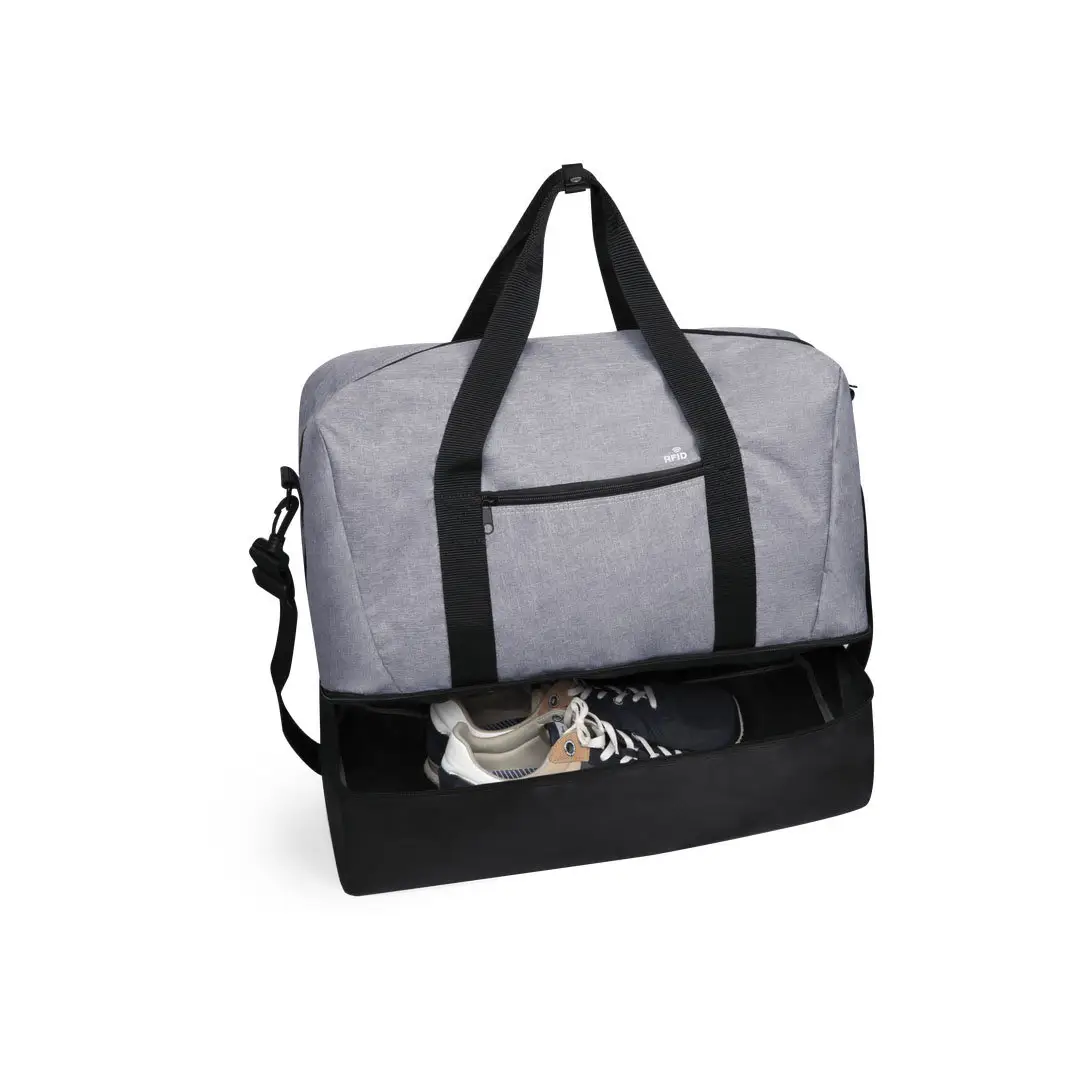 Bolso multiusos en resistente poliéster 600D de acabado denim. De diseño urbano, incluye bolsillo con tecnología de seguridad RFID (Identificación por Radio Frecuencia) que mantiene seguros tus dispositivos de transmisión de identidad. Compartimento independiente de cierre de cremallera para el calzado y bolsillo lateral de cremallera. Compartimento principal con cierre de cremallera de doble tirador y asas de transporte reforzadas, con cierre de botón. Refuerzo de nylon alrededor del cuerpo y cinta bandolera ajustable.