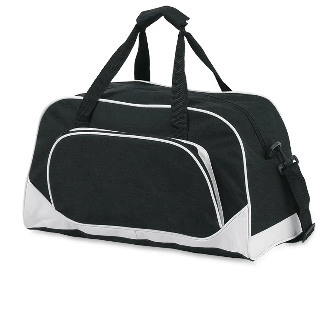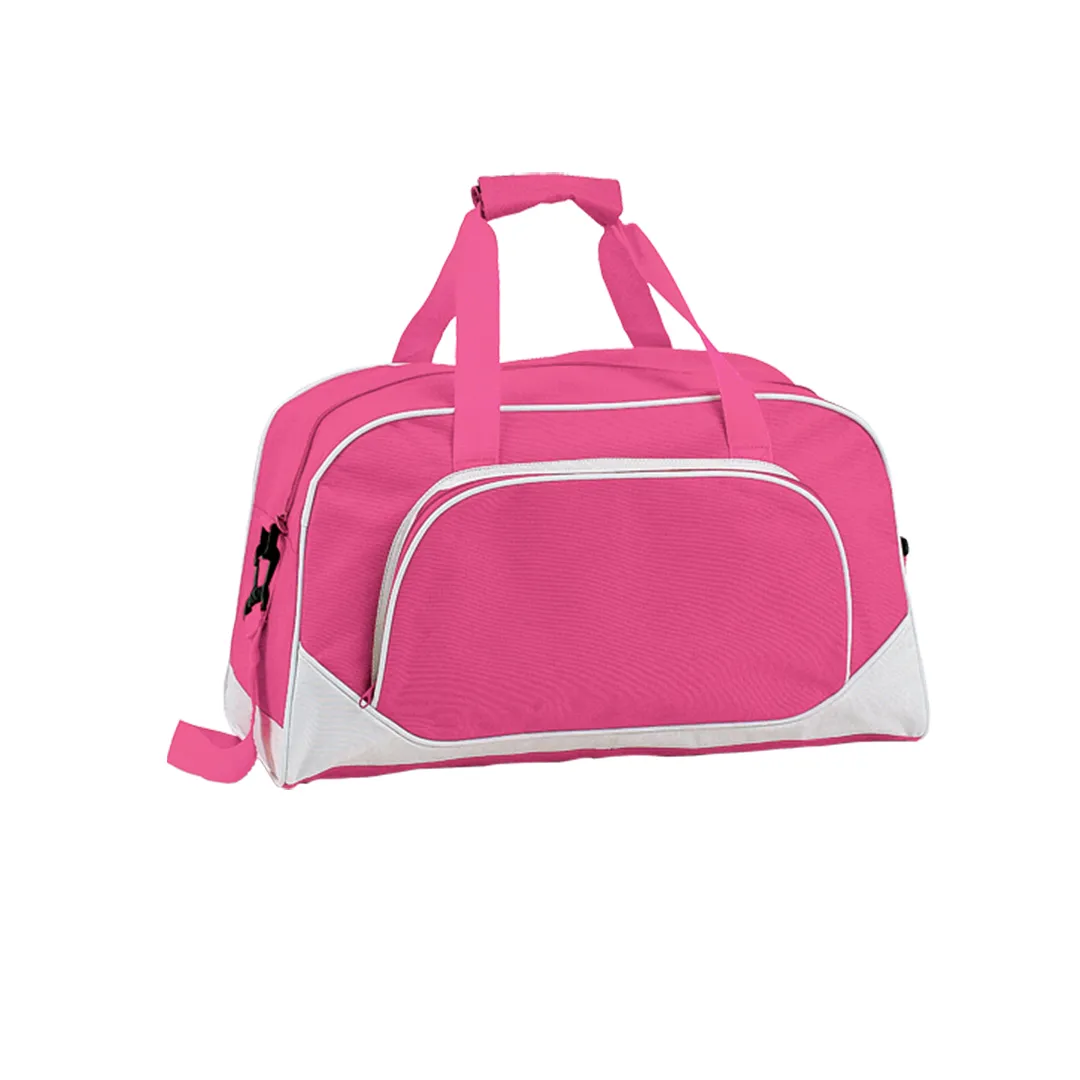 Bolso multiusos en resistente poliéster 600D de desenfadado diseño bicolor en amplia gama de colores, con ribetes de refuerzo y base en color blanco. Compartimento principal y bolsillo exterior con cierre de cremallera a juego. Con resistentes asas de nylon a juego con cierre de velcro y cinta bandolera ajustable de doble cierre de mosquetón.
