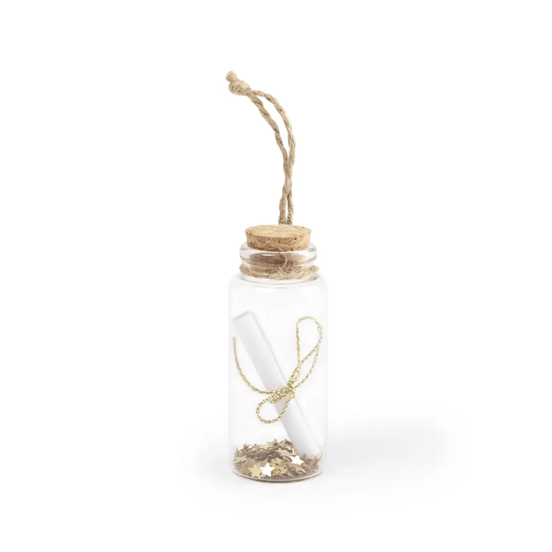 Botecito para guardar tus mejores deseos de esta navidad. Incluye pergamino de papel y bote en cristal. Con tapón y lacito para colgar, presentado en cajita blanca individual