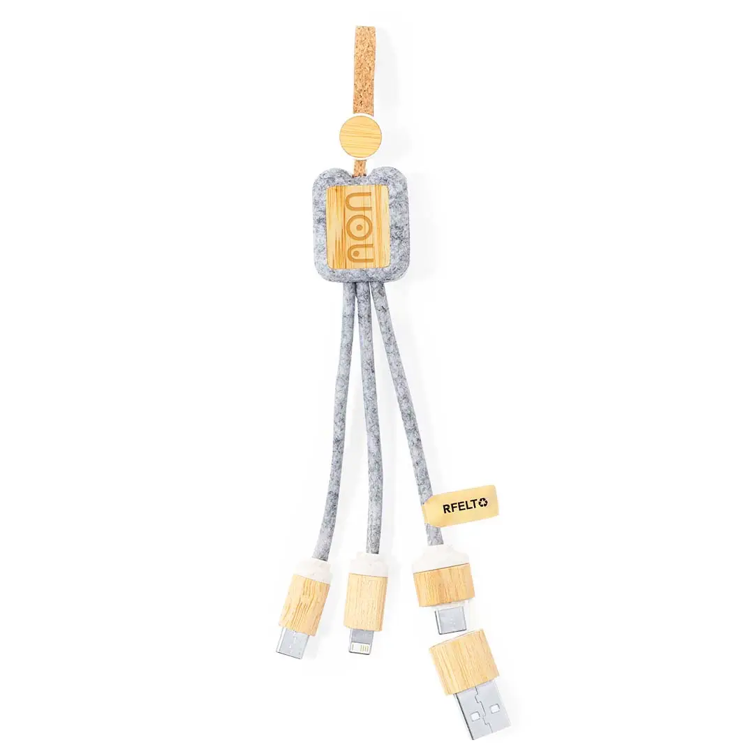 Cable cargador fabricado en bambú y fieltro RPET. Con conexiones de entrada Tipo C y USB y salidas Tipo C, lightning y Micro USB. 5V DC 2.4A. Presentado en bolsa individual de diseño kraft con autocierre, con distintivo en etiqueta.El fieltro RPET reciclado es fruto de la combinación del proceso de reciclaje de materiales plásticos junto a la técnica milenaria de fabricación del fieltro, dando como resultado un material de eco-tendencia que, además de ser de origen reciclado, también se convierte en reciclable.