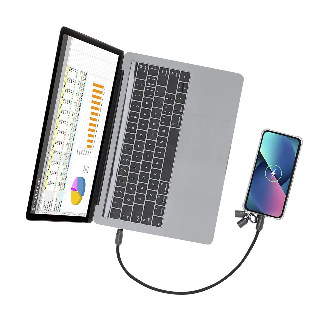 Lanyard cable de carga con función de transferencia de datos y soporte para móvil. Con entrada/salida Tipo C y capacidad de 60W , lo que permite una carga rápida. Funcionalidad y comodidad en un solo accesorio.