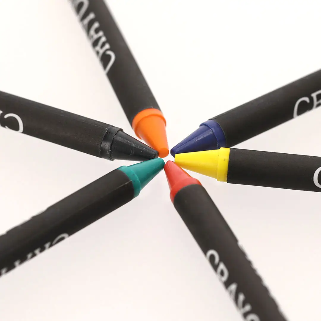 Set de 6 ceras en caja de cartón reciclado de color negro.El Cartón Reciclado proviene del reaprovechamiento de excedente de fabricaciones y reciclaje de papel en el final de su vida útil, convirtiéndose en un lienzo ecológico y sostenible.