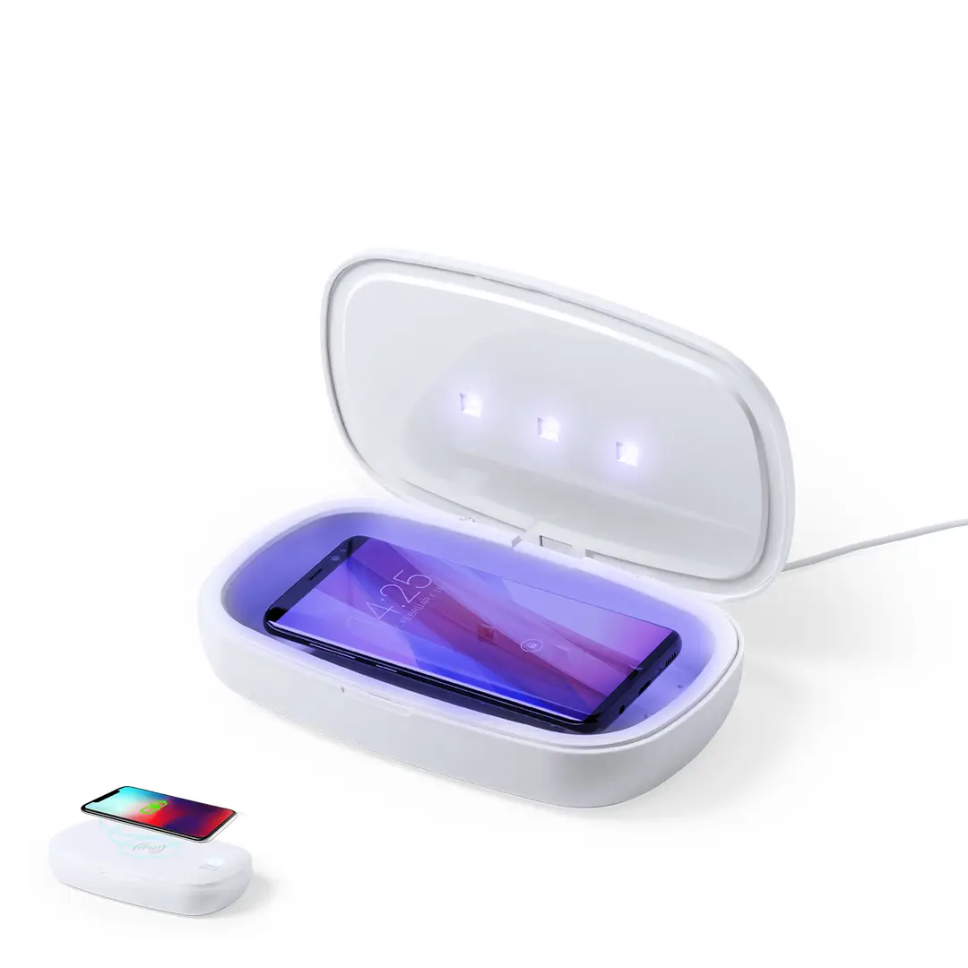 Caja esterilizadora de luz ultravioleta tipo C, con cargador inalámbrico para smartphone integrado en tapa. Especialmente diseñada para la eliminación de microorganismos y bacterias en objetos de uso cotidiano como el smartphone, llaves, gafas, mascarilla, auriculares, smartwatch… Fabricada en resistente material ABS de acabado mate y presentada en atractiva caja individual de diseño. Fácil de usar, basta con introducir el objeto dentro de la caja. Potencia de bombilla 1W longitud de onda de 270-280 nm, con alimentación mediante cable USB Tipo C de 1m de largo con color a juego. Tiempo de esterilización de 5 y 10 minutos con función auto-apagado. Disponible manual de usuario en español e inglés. Disponible certificación CE, RoHS y de efectividad germicida. Para un uso adecuado del producto, evitar el contacto con la piel y los ojos.