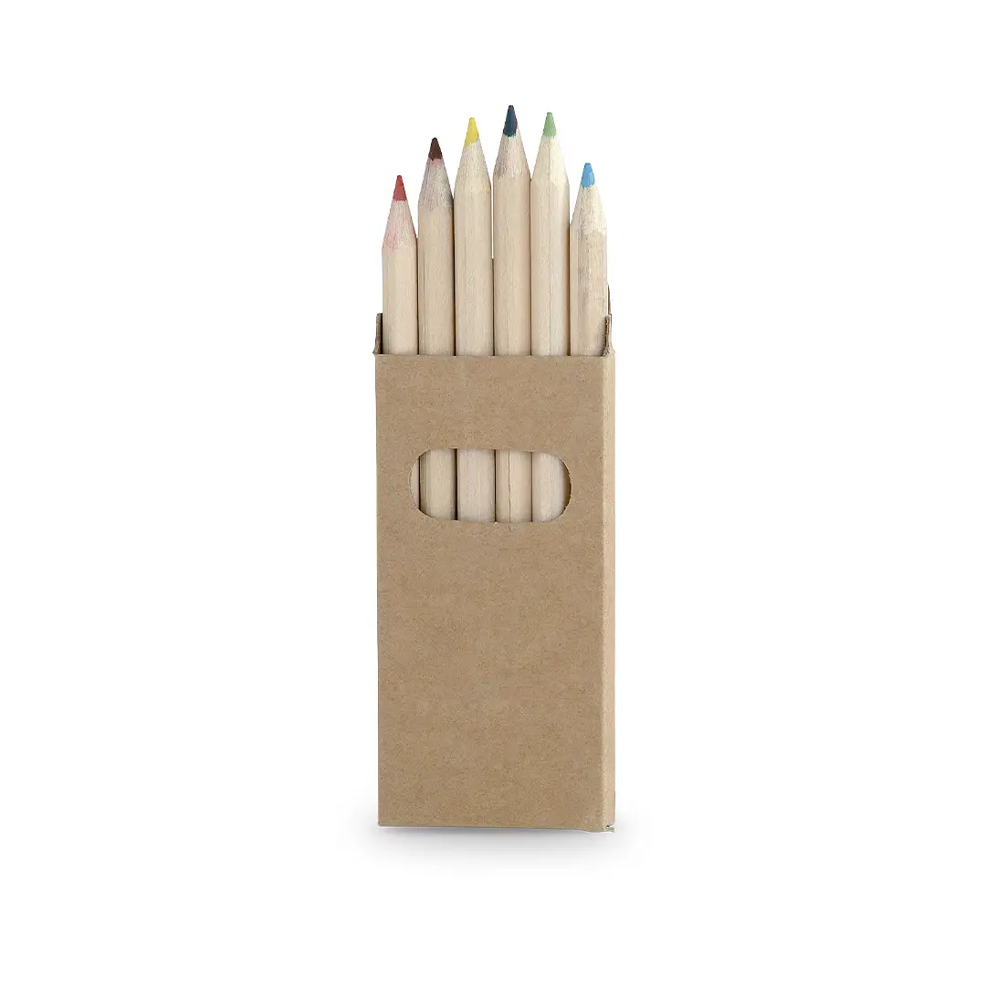 Set de 6 lápices en caja de cartón natural con ventana. Lápices de madera con cuerpo hexagonal de acabado natural y minas en variada gama de colores.