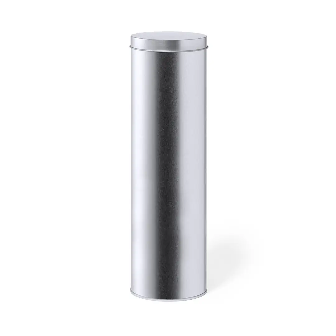 Caja de presentación formato cilíndrico, fabricada en resistente metal de acabado plateado y con tapa a juego.