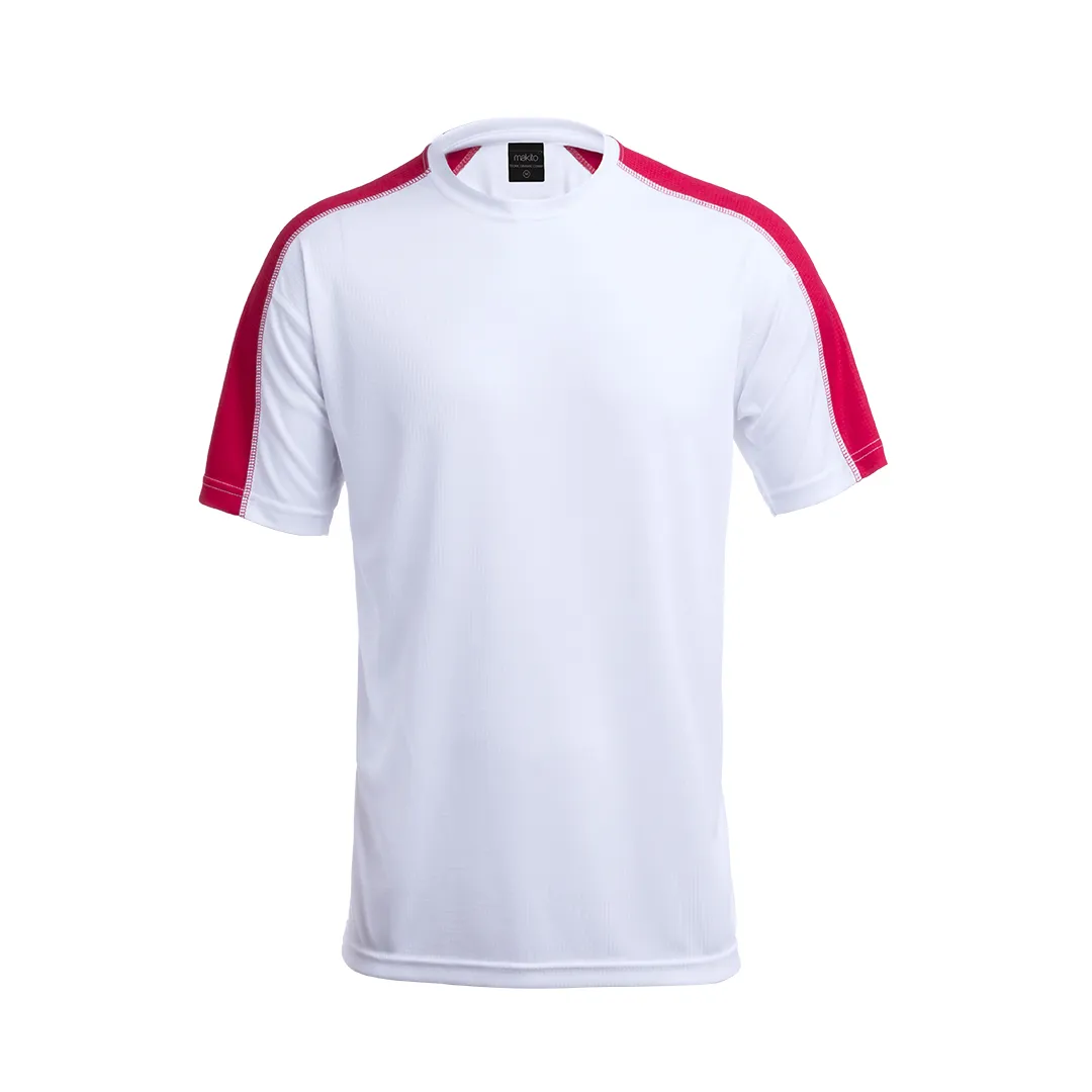 Camiseta técnica para adulto en material dynamic, altamente transpirable y confeccionada en tela 100% poliéster de 135g/m2. Original diseño en color blanco, con franja de color en las mangas. Disponible en variados colores y en tallas S, M, L, XL, XXL.