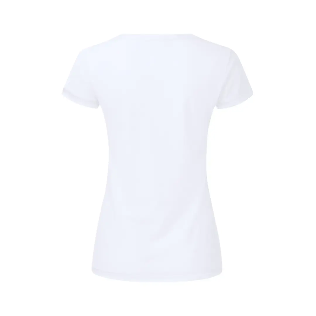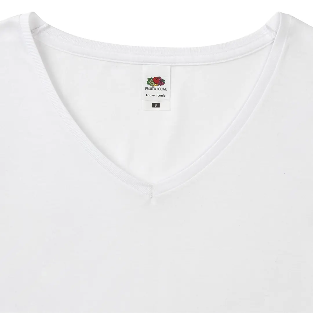 Camiseta para mujer blanca Iconic V-Neck de Fruit Of The Loom. Fabricada en material 100% algodón peinado Ring Spun de 140g/m2 hilado en anillo. De tacto suave y corte entallado, con costuras laterales diseñadas para un ajuste perfecto. Con cuello en pico estrecho de canalé 1×1 y tapeta a juego. Etiqueta fácilmente removible y disponible en tallas XS, S, M, L, XL, XXL.
