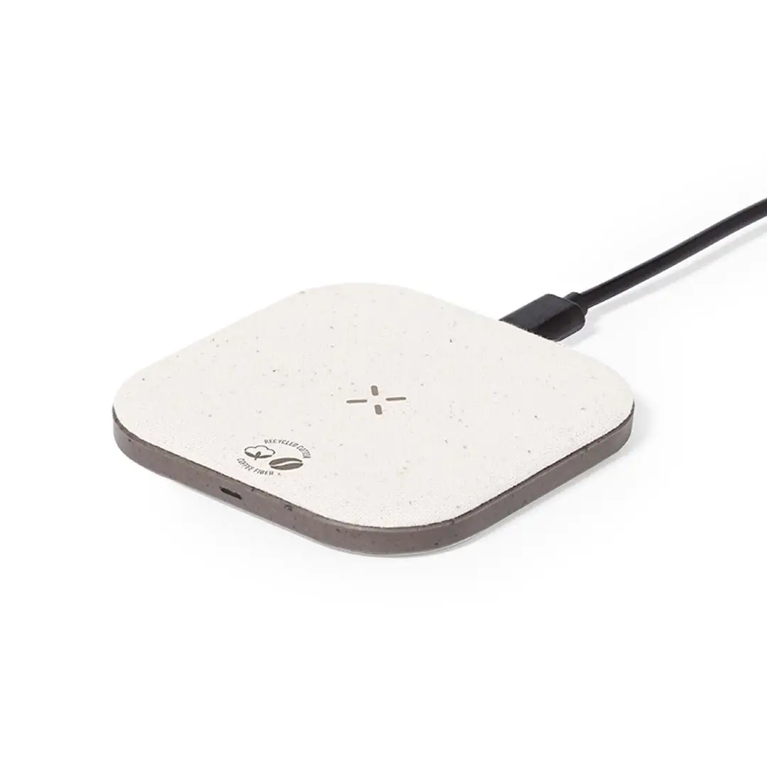 Cargador inalámbrico fabricado en fibra de café y algodón reciclado. Base antideslizante y compatible con dispositivos equipados con tecnología de carga Qi. Capacidad de carga de 15W, con cable negro Tipo C incluido. Con distintivos de fibra de café y algodón reciclado. Presentado en atractiva caja de diseño kraft, con manual de instrucciones en español e inglés.La fibra de café es una solución circular que se obtiene de la utilización de los residuos producidos en la obtención del café. Una alternativa sostenible que favorece la reducción del uso de plásticos, ahorrando energía en su proceso de fabricación y contribuyendo al cuidado del medio ambiente.Disponible certificación GRS (Global Recycled Standard / Estándar de Reciclaje Global), que garantiza el origen reciclado del material usado para fabricar el producto.
