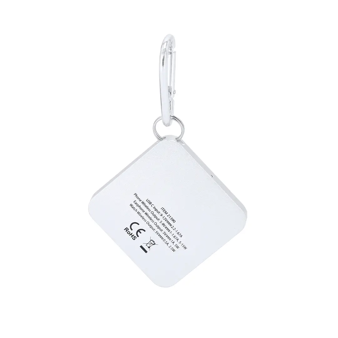 Cargador inalámbrico 15W fabricado en aluminio. Diseñado para la carga de smartphone, auriculares y smartwatch. Con fijación magnética. Incluye mosquetón metálico de transporte. Conexión tipo C.