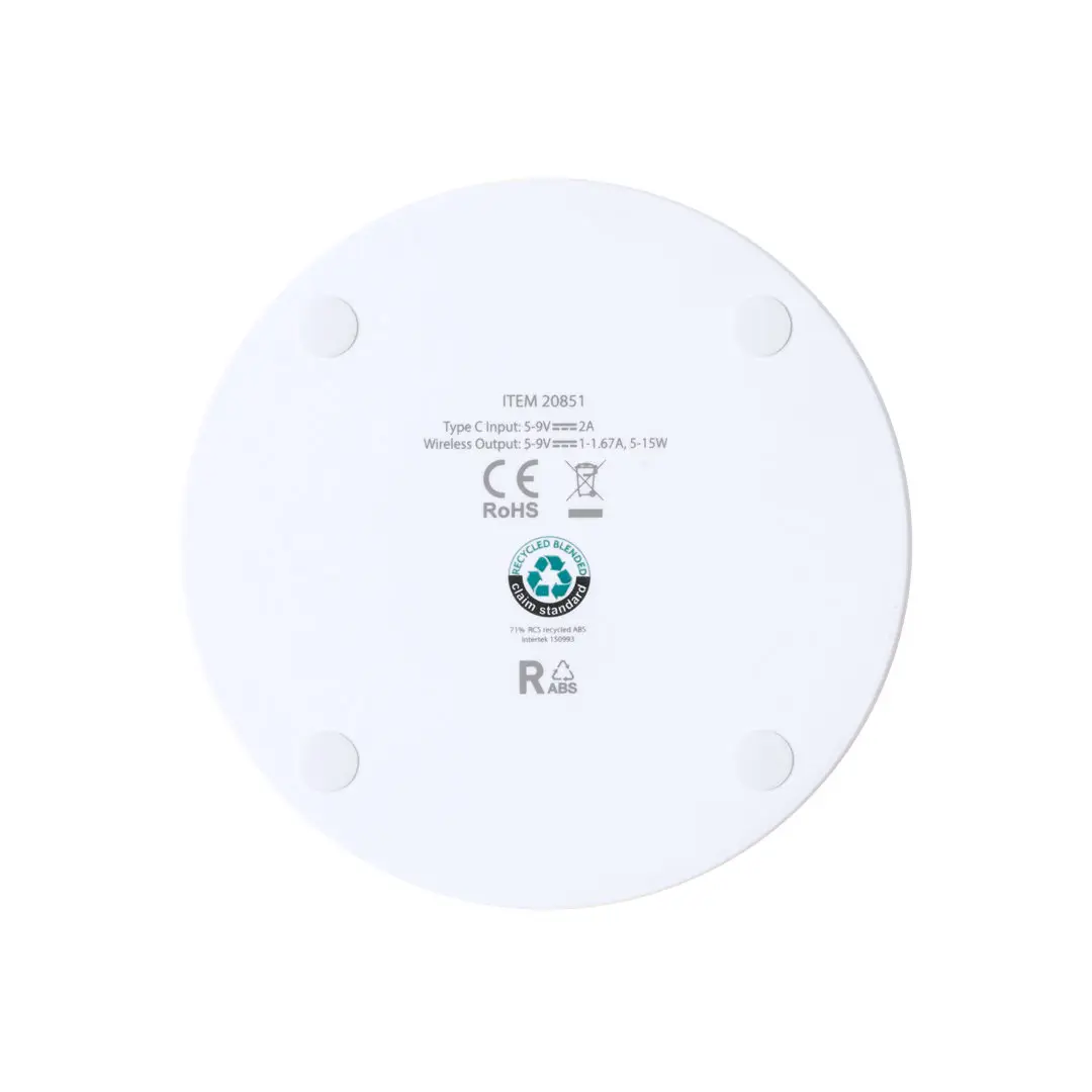 Cargador inalámbrico 15W de diseño circular fabricado en RABS. Compatible con dispositivos equipados con tecnología de carga inalámbrica Qi. Base antideslizante, con cable cargador Tipo C incluido. Presentado en caja individual de diseño kraft, con manual de instrucciones en español e inglés.El RABS es un plástico altamente reciclable de gran resistencia y con multitud de aplicaciones que lo convierten en una solución eco-friendly. Con certificación RCS, que garantiza el origen reciclado del mismo.Fabricado conforme a los estándares RoHS y en cumplimiento con los siguientes requisitos de seguridad:Sistema de protección contra sobrecalentamiento.Sistema de protección contra sobrecarga.Sistema de bloqueo para evitar cortocircuitos.