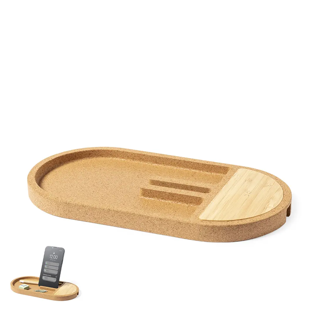 Cargador organizador inalámbrico 15W. Con base fabricada en en corcho natural y superficie de carga en bambú. Soporte para smartphone integrado y espacio de almacenaje para artículos de escritorio. Compatible con dispositivos equipados con tecnología de carga inalámbrica Qi, con indicador LED de estado de carga y cable de carga Tipo C incluido. Base antideslizante y presentado en caja individual de diseño kraft, con manual de instrucciones en español e inglés.Fabricado conforme a los estándares RoHS y en cumplimiento con los siguientes requisitos de seguridad:Sistema de protección contra sobrecalentamiento.Sistema de protección contra sobrecarga.Sistema de bloqueo para evitar cortocircuitos.