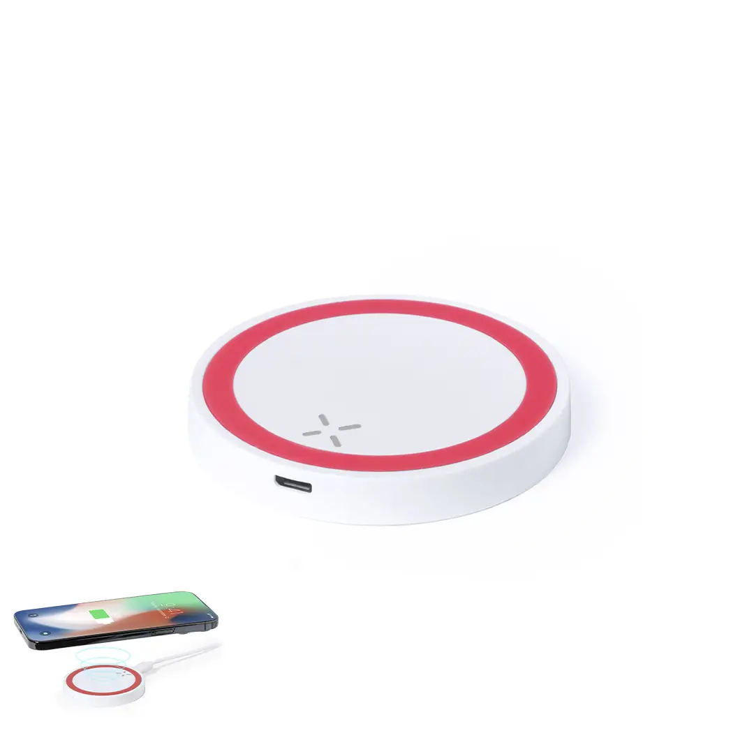 Cargador inalámbrico circular de diseño bicolor. Con base antideslizante e indicador LED de estado de carga. Compatible con smartphones con tecnología de carga inalámbrica y presentado en atractiva caja de diseño.