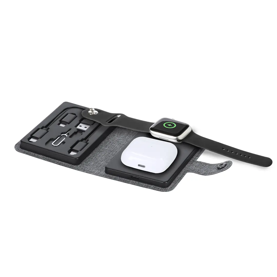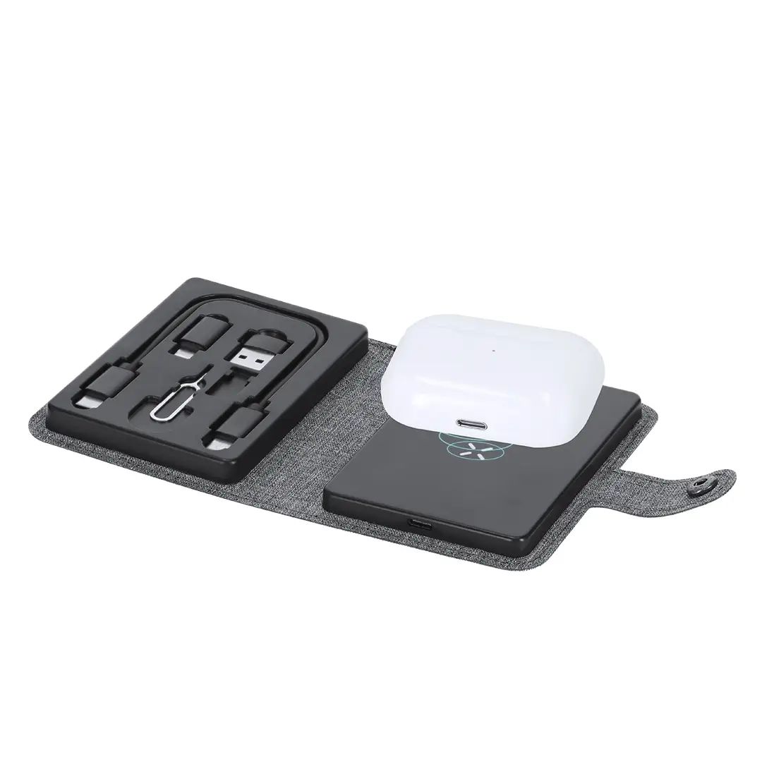 Completa base cargadora fabricada en 300D RPET. Estuche con cierre de corchete incluyendo base cargadora inalámbrica Qi para smartphone, auriculares y smartwatch. Contiene cable de conexión Tipo C en ambos extremos, además de adaptadores USB y lightning/micro USB. El set lo completa un eyector de tarjeta SIM y un compartimento para guardar una tarjeta Micro SIM. Con distintivo RPET.El material RPET se elabora a partir de plástico reciclado, para así fomentar la reutilización de residuos plásticos y ayudar a la sostenibilidad del planeta.