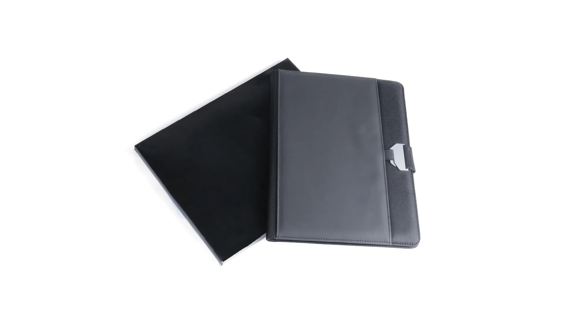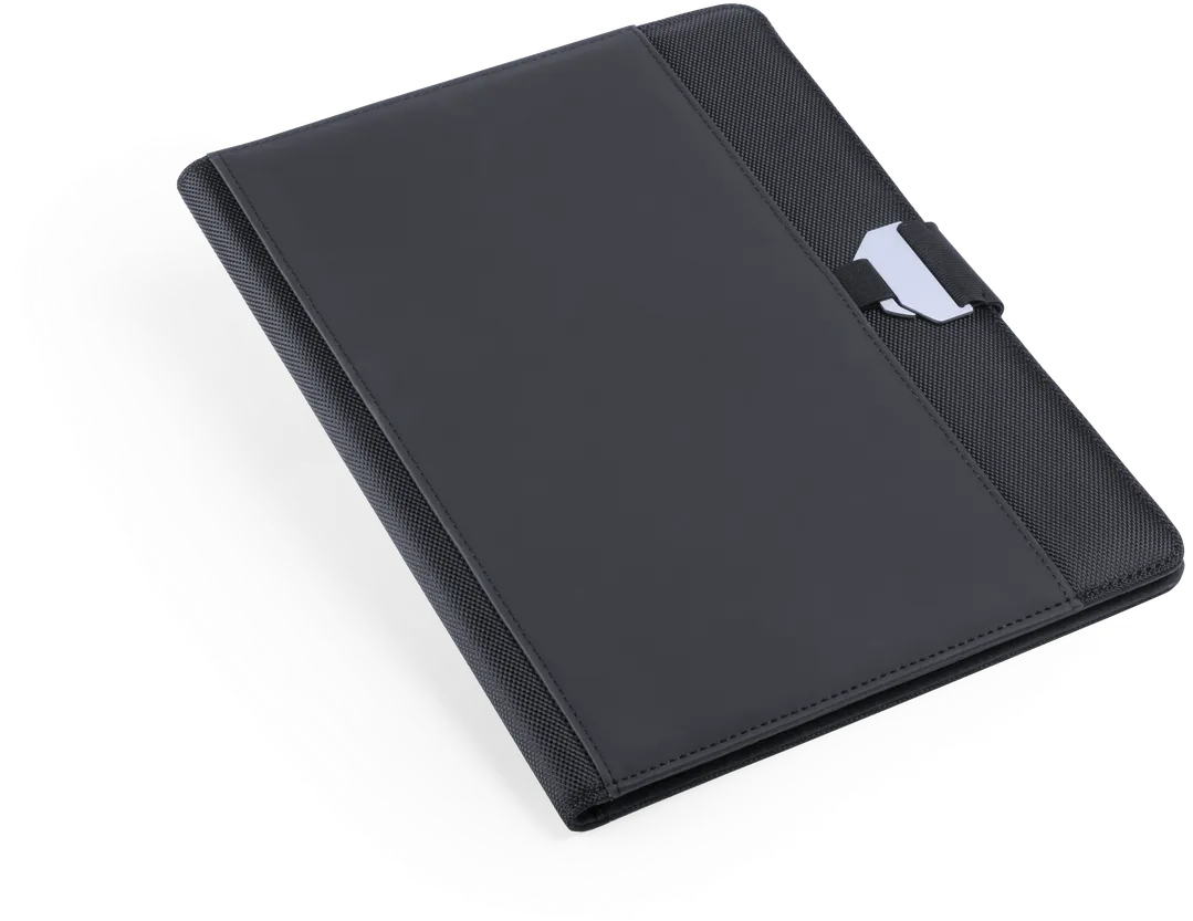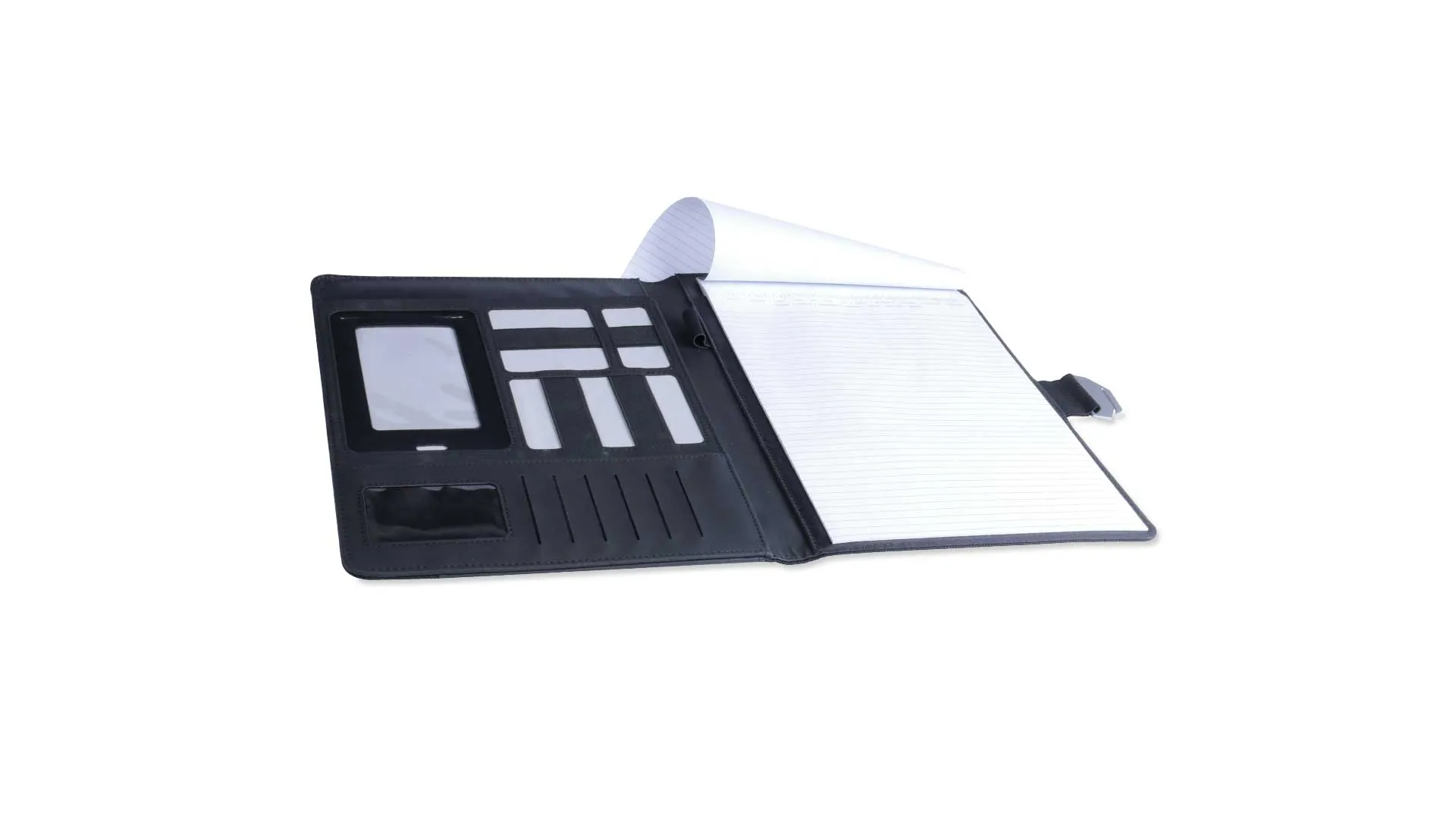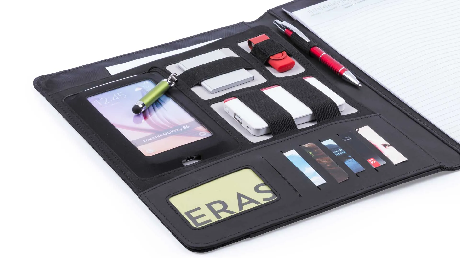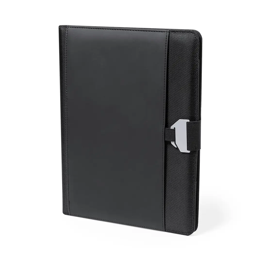 Carpeta tecnológica en elegante combinación de poliéster y suave polipiel. con original cierre metálico. Interior con compartimentos para memoria USB, powerbank, compartimento táctil para smartphone, tarjeteros y soporte para bolígrafo. Con bloc de notas extraíble de 20 hojas a una raya y presentada en elegante caja negra.