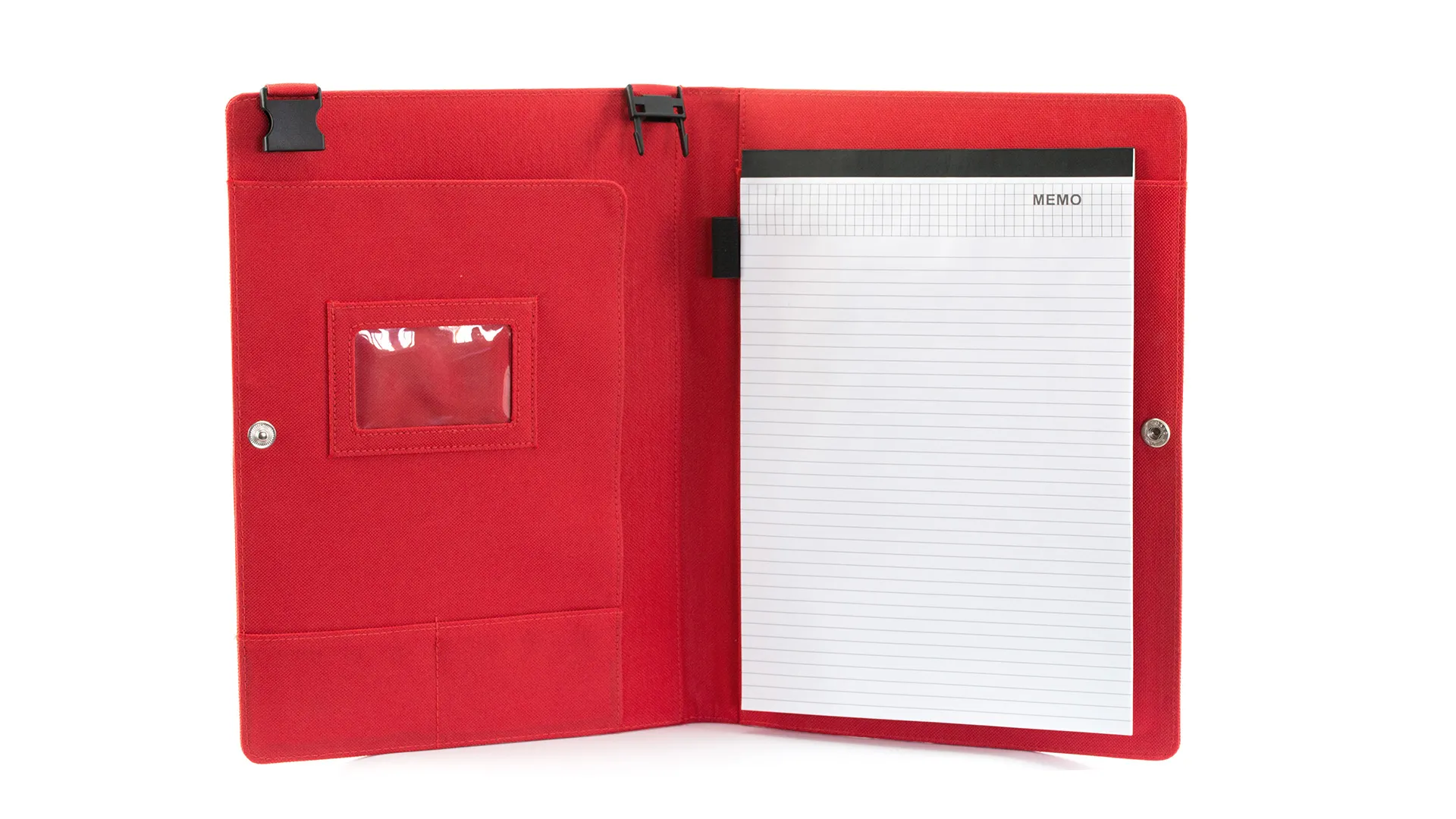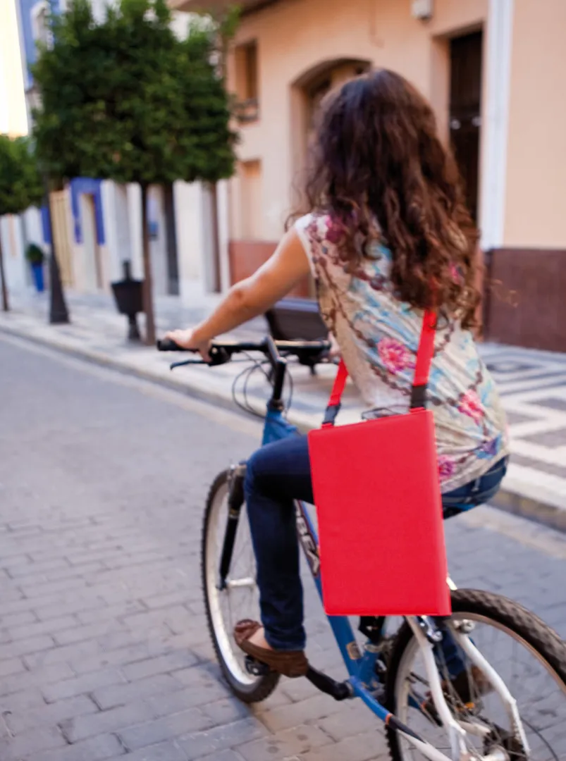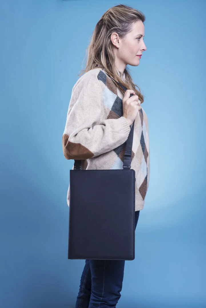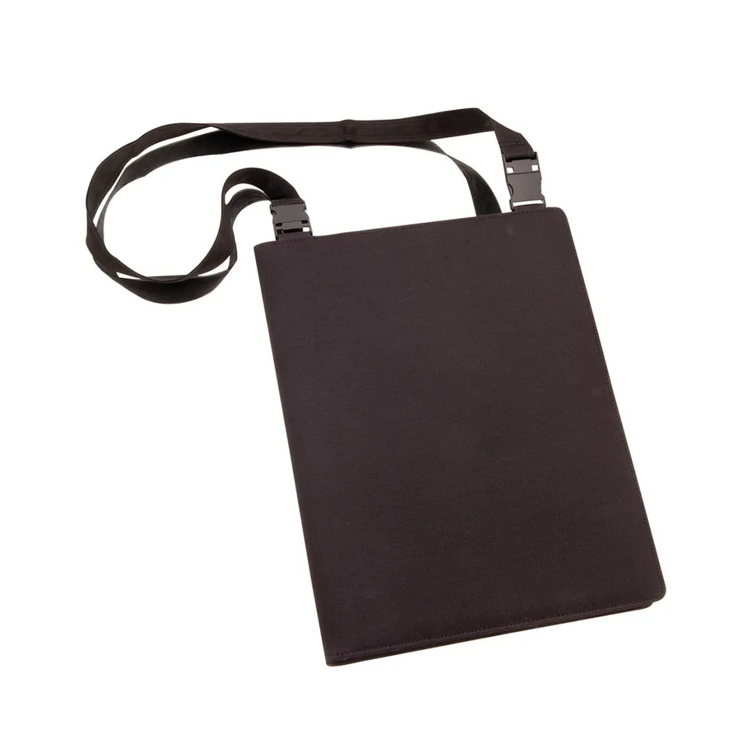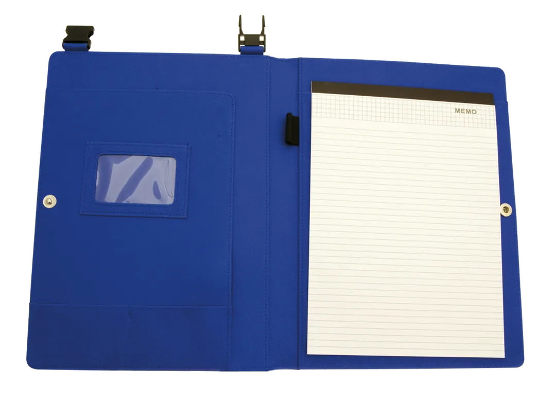 Original carpeta de poliéster 600D con cinta bandolera desmontable. Interior con bloc extraíble de 20 hojas lisas, bolsillo de solapa, tarjeteros y soporte para bolígrafo.