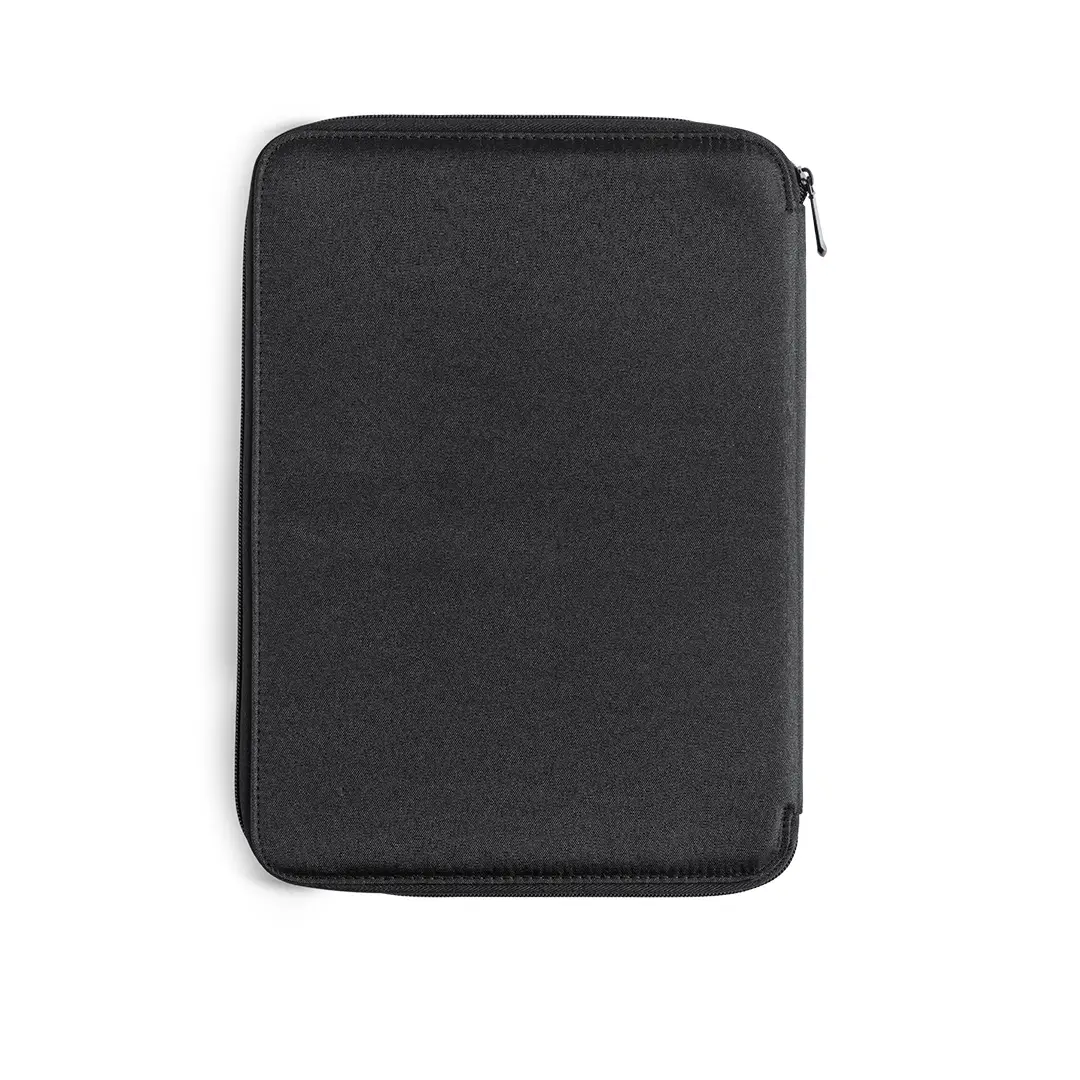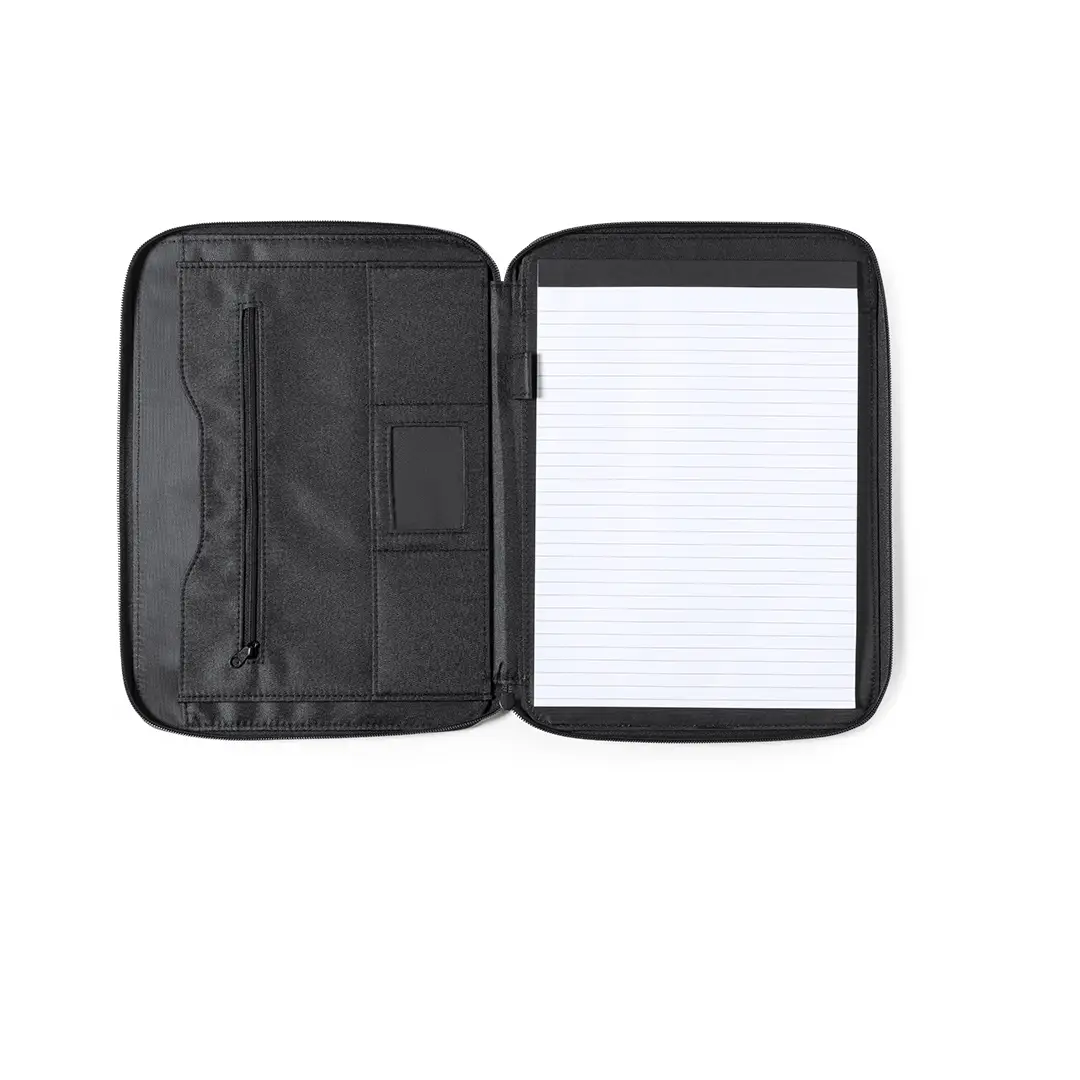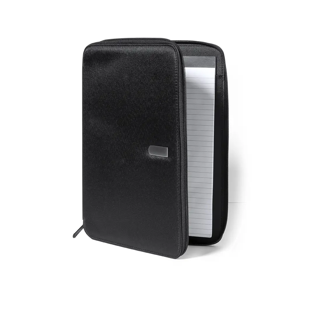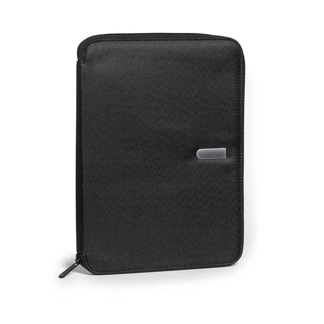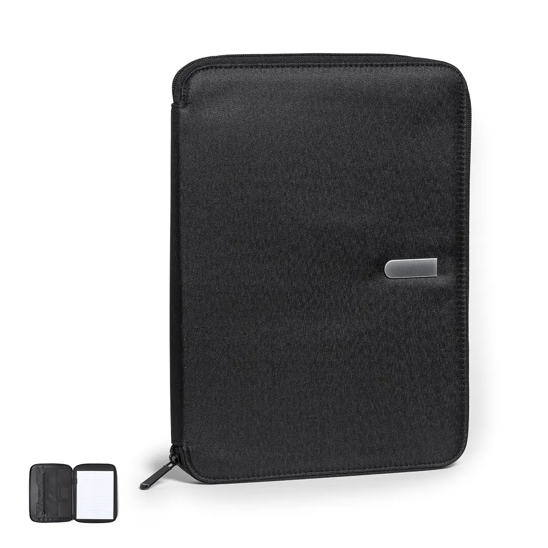 Elegante portadocumentos de cierre de cremallera acabado en suave microfibra. Interior con bloc extraíble de 20 hojas de distribución a una raya, bosillo de cremallera, bolsillo solapa, tarjeteros y soporte para bolígrafo. Con elegante chapa metálica en frontal para marcaje en láser.