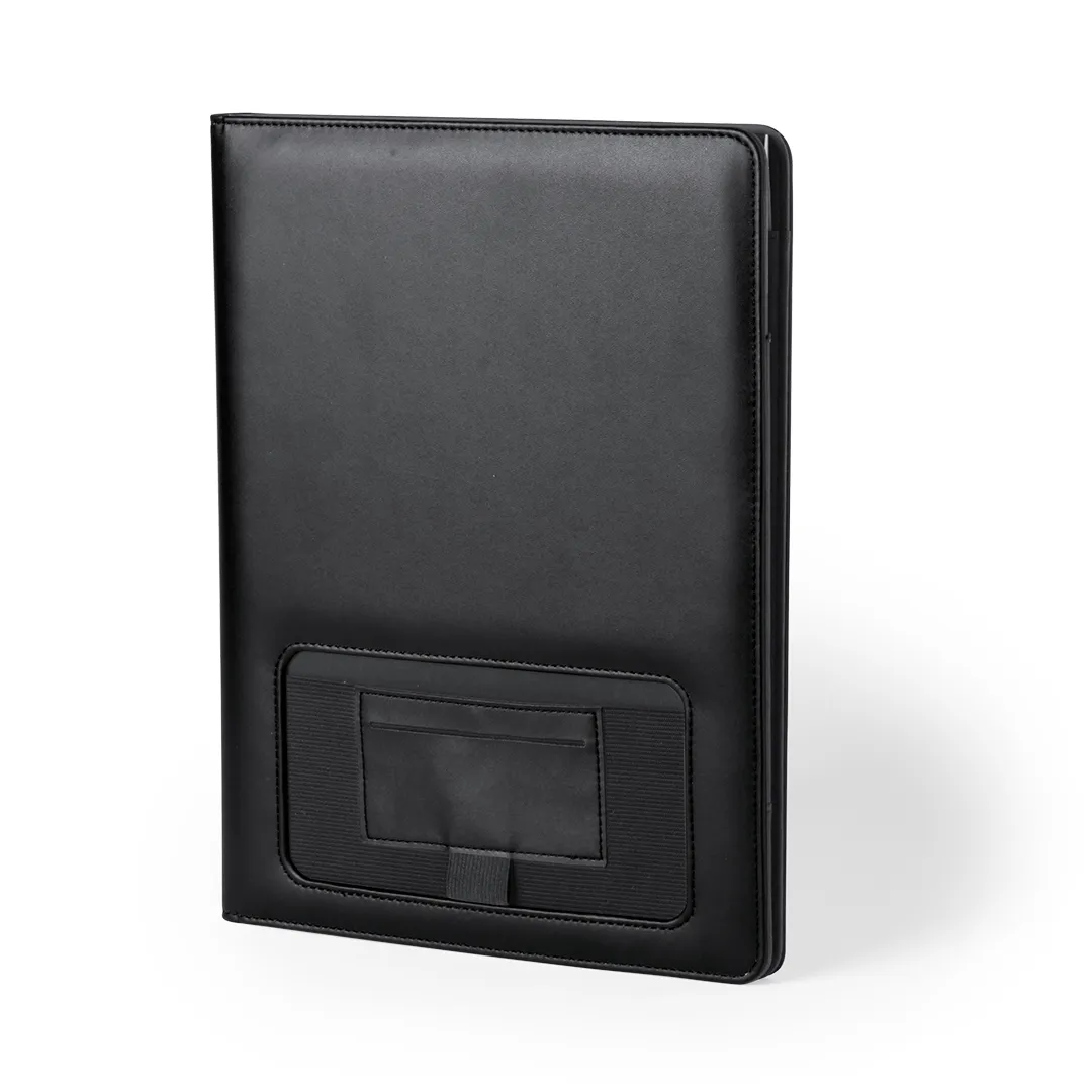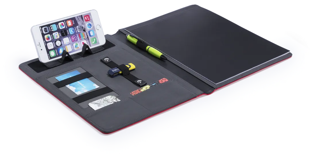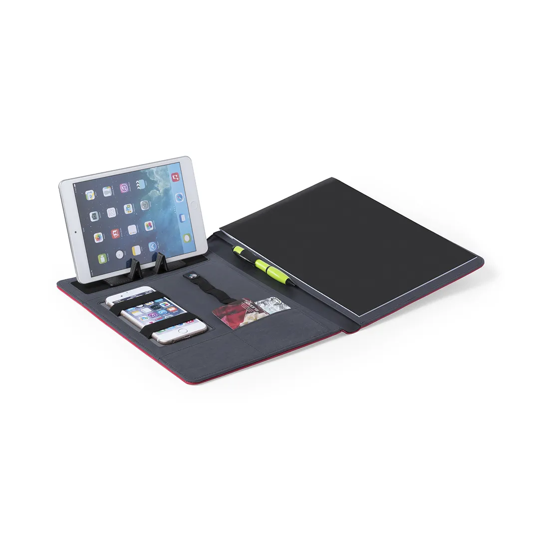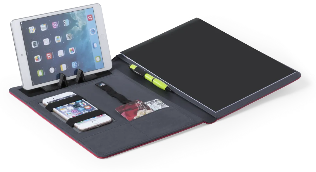 Carpeta tecnológica de alta calidad en vivos colores acabada en suave polipiel y original diseño con bolsillo en portada. Interior con soporte para tablet de hasta 10 pulgadas, soporte para smartphone, bloc extraíble de 20 hojas de distribución a una raya, con calendario y soporte para bolígrafo. Presentada en elegante caja individual negra.