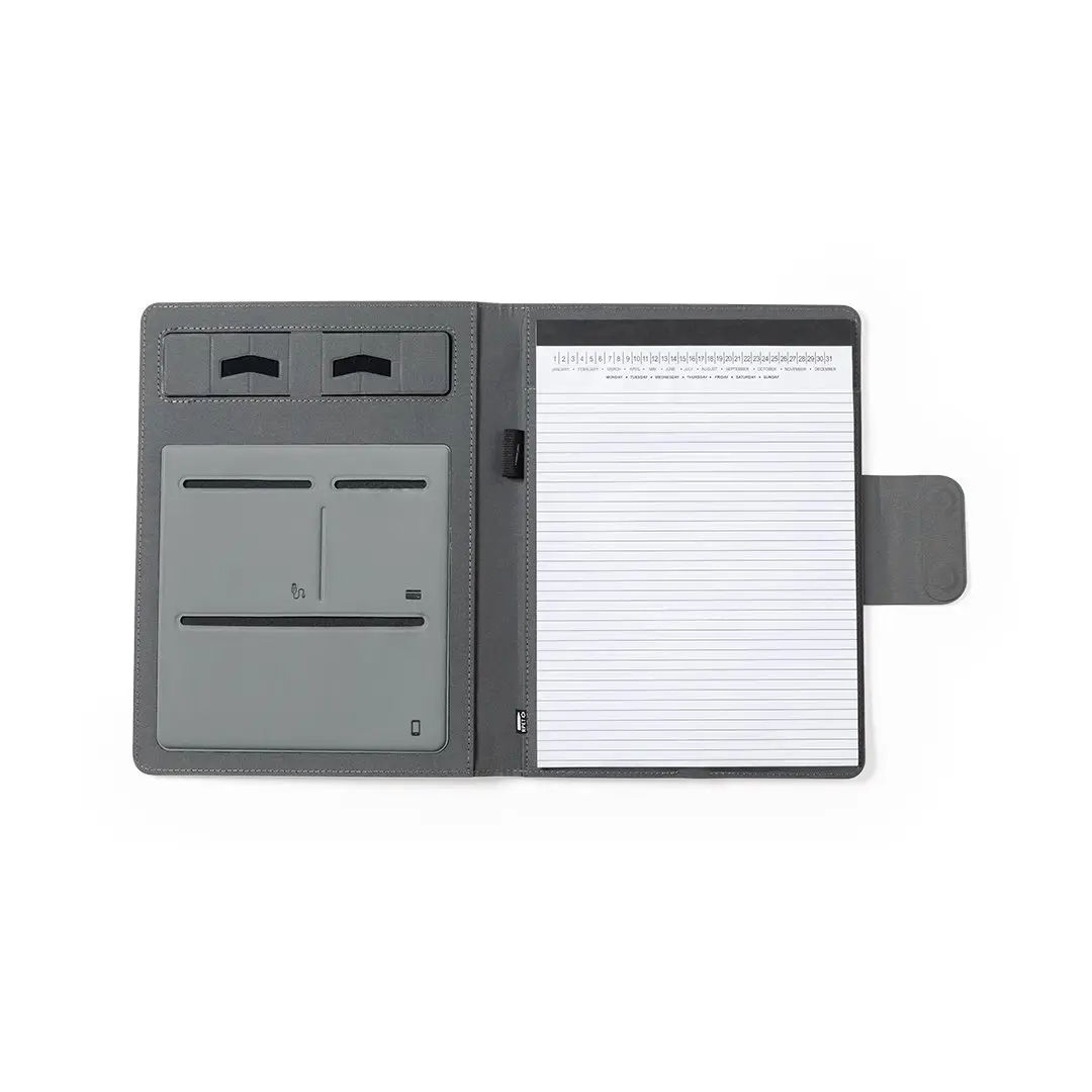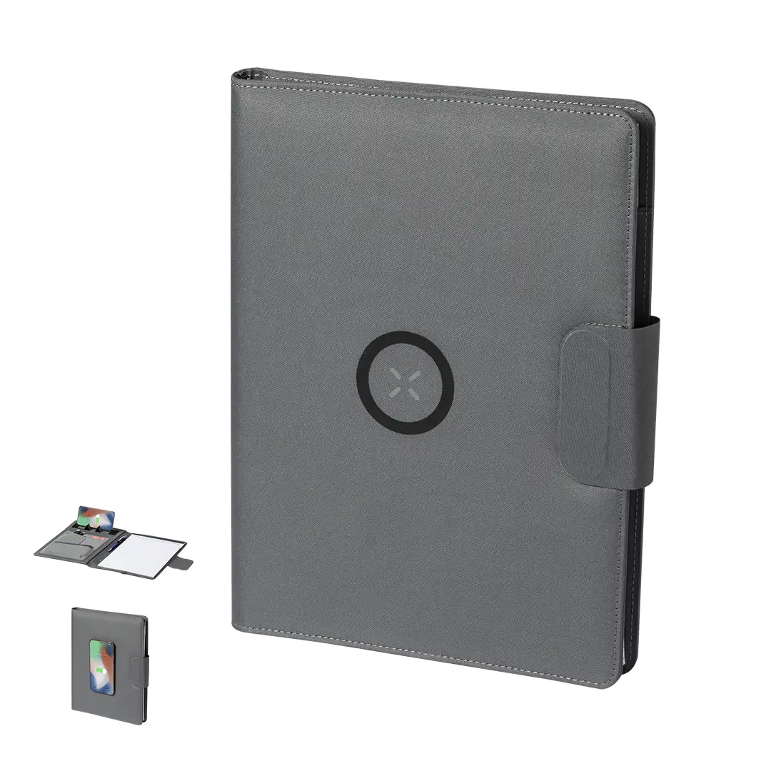 Carpeta/bloc multifunción fabricada en poliéster 300D RPET, elaborado a partir de plástico reciclado, para así fomentar la reutilización de residuos plásticos y ayudar a la sostenibilidad del planeta. Con cierre magnético y etiqueta interior con distintivo RPET. Incluye cargador inalámbrico 10W integrado en portada, con fijación magnética para poder usar el dispositivo mientras se produce la carga del mismo e incluyendo anillo adhesivo, válido para todos los dispositivos con tecnología Magsafe y Qi. Batería integrada de 5.000 mAh de capacidad de carga, con puerto Tipo C de entrada/salida y LEDs indicadores de estado de carga, con cable incluido. Interior con soporte para smartphone y multitud de compartimentos para tarjetas, incluidos soporte para bolígrafo y bloc A4 con 20 hojas de disposición a una raya. Presentada en atractiva caja individual de diseño. Las capacidades mostradas en todas nuestras baterías auxiliares externas son reales, incorporando todas ellas baterías de grado A y no recicladas, con una vida útil de al menos 500 ciclos de carga y según normativa CE. Además, están fabricadas conforme a los estándares RoHS y en cumplimiento con los siguientes requisitos de seguridad: Sistema de protección contra sobrecarga del power bank. Sistema de protección contra descarga completa que proporciona una mayor durabilidad del power bank. Sistema de bloqueo para evitar cortocircuitos. Sistema de transferencia de carga constante, acorde con la capacidad del dispositivo de destino.