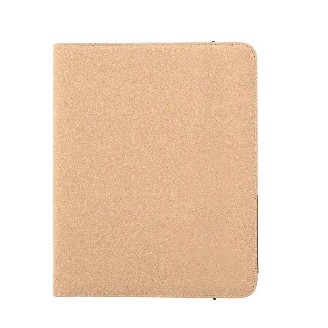 Elegante carpeta archivadora fabricada en corcho natural. Con bolsillo interior grande para folios, 4 portatarjetas, elástico para bolígrafo y bloc de 20 hojas con disposición a una raya. Cierre mediante una banda elástica en su exterior. Presentado individualmente en bolsa reciclada. Elaborado con elementos vegetales para así fomentar la utilización de materias primas naturales y reducir las emisiones contaminantes.