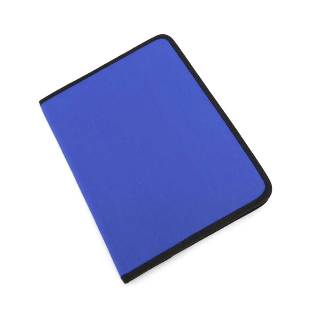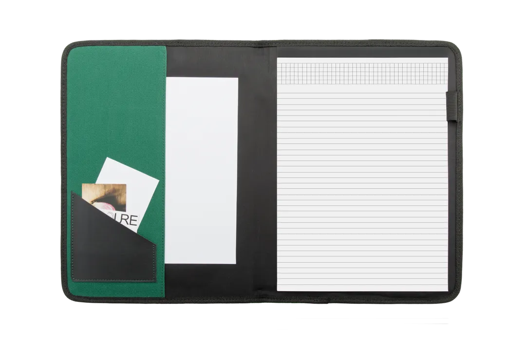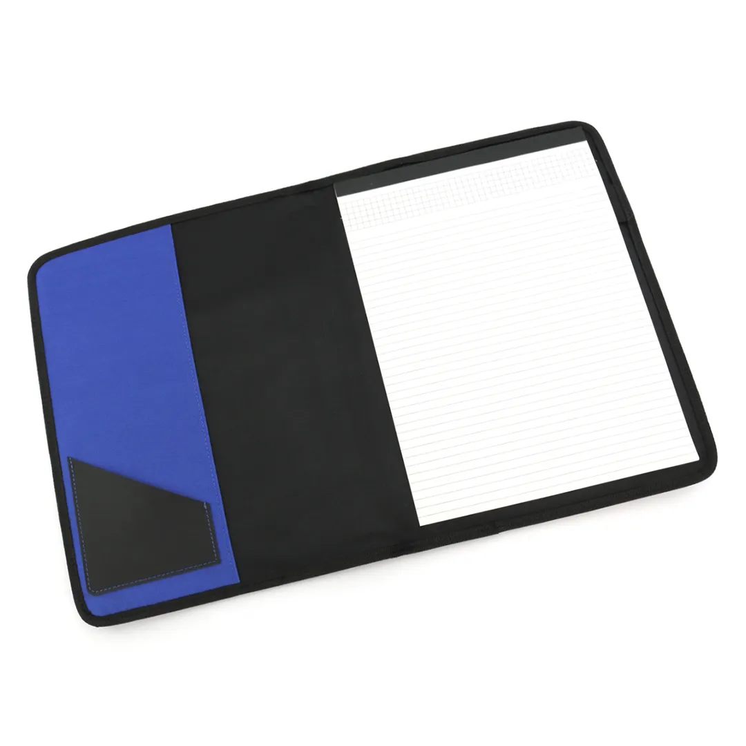 Carpeta en variados colores acabada en resistente poliéster 600D con ribete reforzado en negro. Interior con bloc extraíble de 20 hojas lisas, 2 bolsillos de solapa y soporte para bolígrafo.