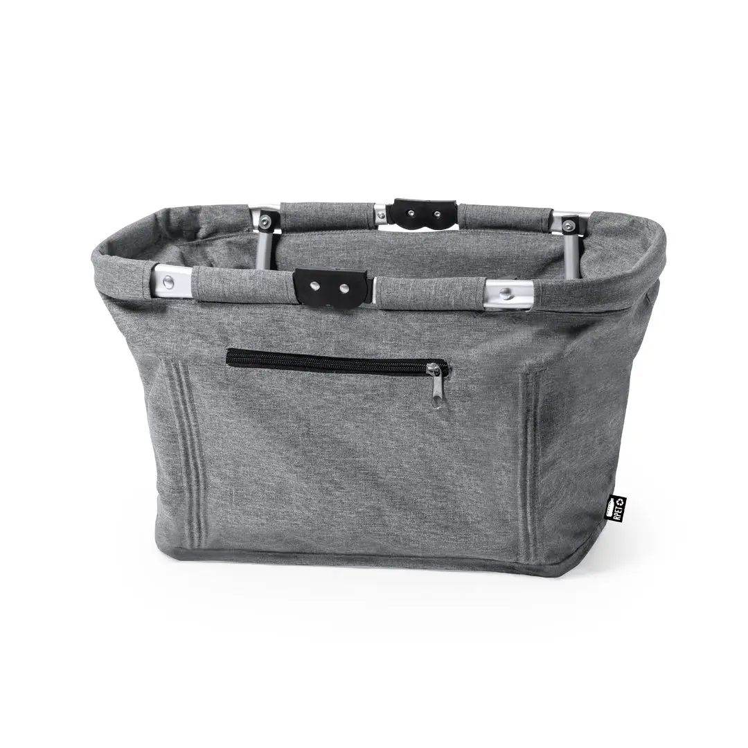 Cesta plegable fabricada en resistente 600D RPET. Con resistente estructura de aluminio y 2 asas de transporte plegables en aluminio, con cinta de velcro a juego. Bolsillo exterior con cierre de cremallera y etiqueta exterior con distintivo RPET. El material RPET se elabora a partir de plástico reciclado, para así fomentar la reutilización de residuos plásticos y ayudar a la sostenibilidad del planeta.