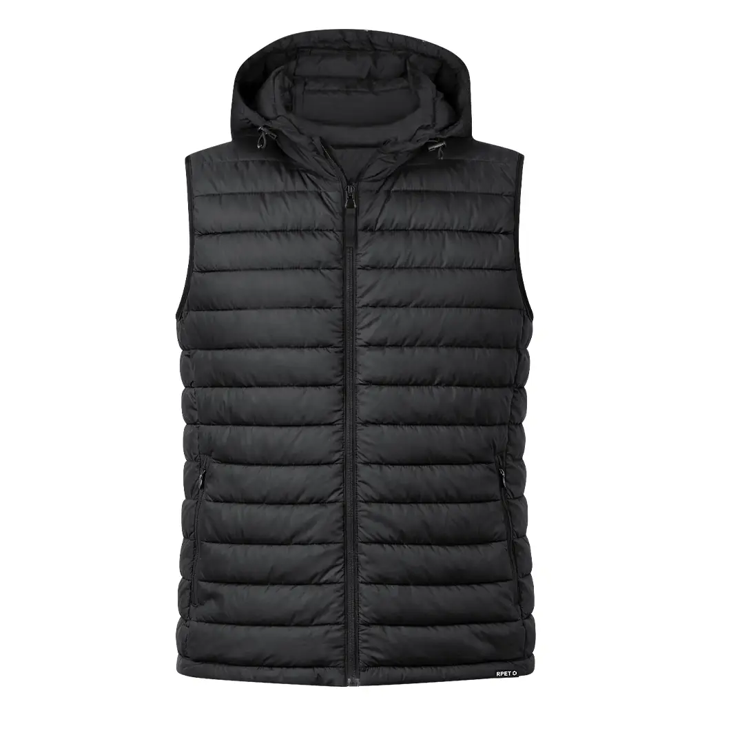 Chaleco unisex en cálido y suave material 100% RPET, con capucha ajustable mediante cintas elásticas. En material extra ligero efecto pluma, resistente al agua y cortavientos. Con acolchado interior, cremallera en cuello con tapeta y cinta en tirador, además de amplios bolsillos laterales con cremallera. Incluye práctica funda de transporte con cordón ajustable y etiqueta con logotipo RPET. Disponible en variada gama de colores y en tallas XS, S, M, L, XL, XXL.El material RPET se elabora a partir de plástico reciclado, para así fomentar la reutilización de residuos plásticos y ayudar a la sostenibilidad del planeta.