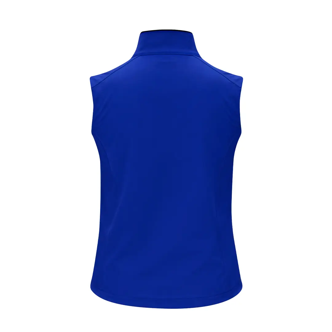 Chaleco Soft Shell RPET confeccionado en 3 capas, de 340 g/m2. Con membrana de 8000mm, impermeable y transpirable. Exterior en Soft Shell e interior en tejido polar microfleece en color negro. Con bolsillo exterior en pecho derecho y dos bolsillos laterales con cremalleras. Con cremallera central y cremalleras invertidas en bolsillos, incluyendo tiradores de cordón en color negro. Cuenta con protector de barbilla a juego y cintura ajustable, con cordón elástico y tope. Distintivo RPET en el ribete de la prenda.
