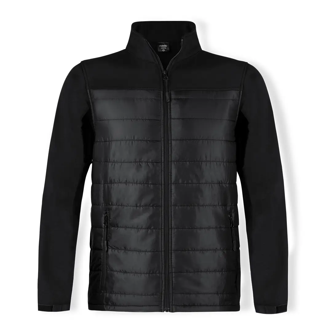 Chaqueta impermeable y transpirable en combinación de materiales soft shell y poliéster. De elegante construcción en color negro, con cierre de cremallera y bolsillos laterales de cremallera con tiradores para fácil apertura. Puños ajustables y disponible en tallas S, M, L, XL, XXL.