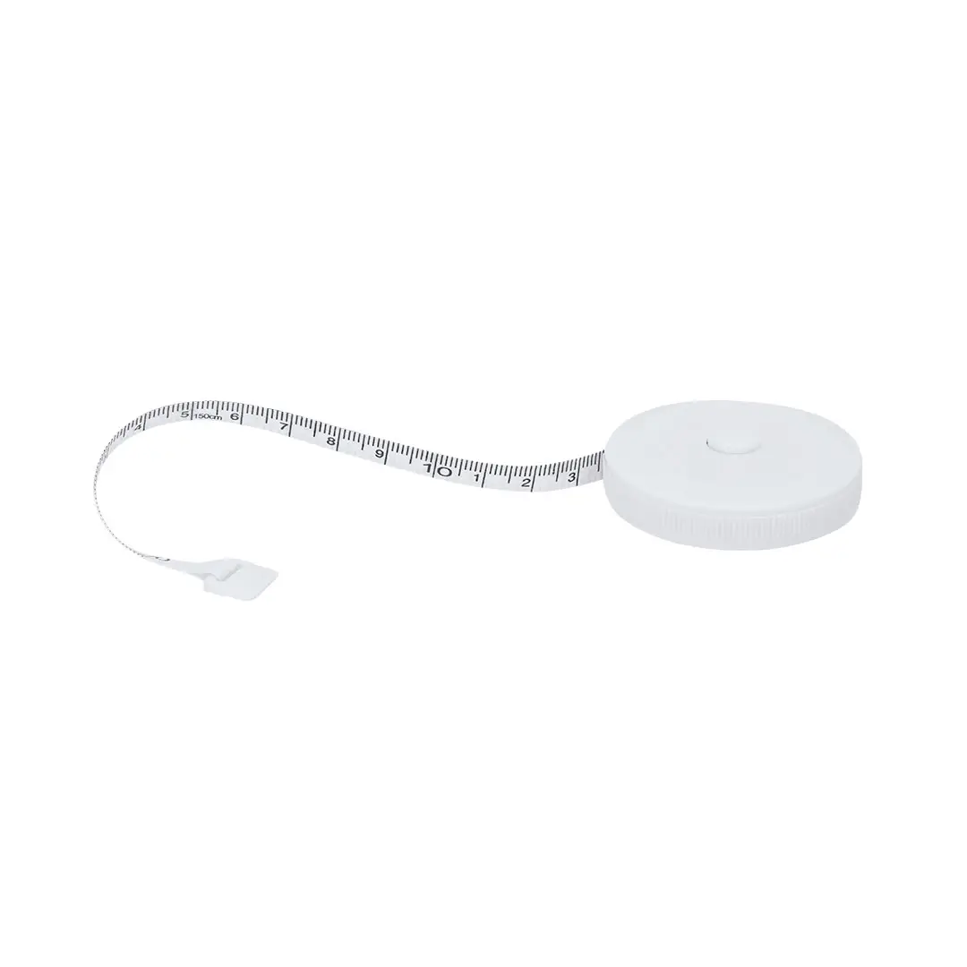 Cinta métrica de PVC de 150cm de largo y mecanismo retráctil con botón de parada. Escala impresa en color negro de cm y pulgadas.