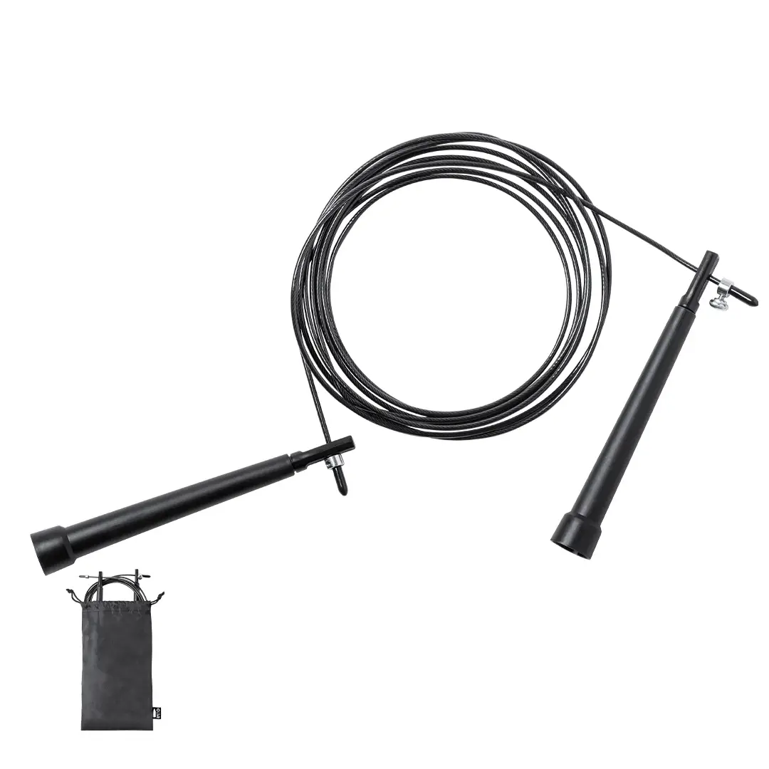 Comba de calidad premium, con cuerda extra larga ajustable de 3m de largo y fabricada en acero con cobertura de resistente PVC. Con mangos de sujeción ergonómicos y presentada en funda de poliéster RPET con cierre de cordón, elaborada a partir de plástico reciclado para así fomentar la reutilización de residuos plásticos y contribuir a la sostenibilidad del planeta. Etiqueta distintiva RPET en la funda.