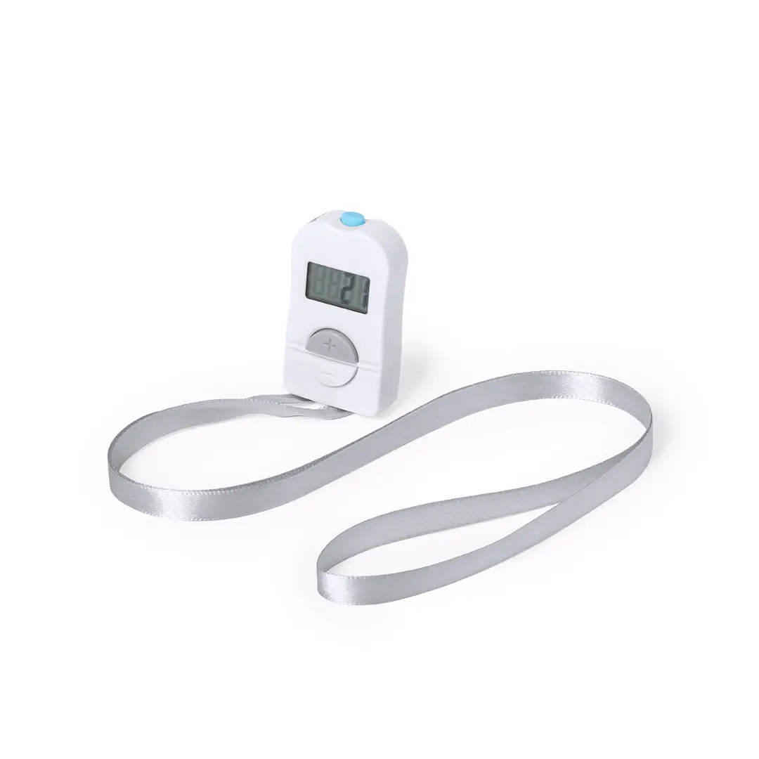 Contador de aforo digital fabricado en resistente material ABS de acabado brillo, con práctica cinta de poliéster y amplios pulsadores para añadir o restar aforo. Pantalla digital con contador de 4 dígitos y botón de reinicio en parte superior. Amplia superficie para logotipo, especialmente diseñado para marcaje en tampografía. Presentado en atractiva caja individual de diseño. Alimentación a pilas, de botón incluida.