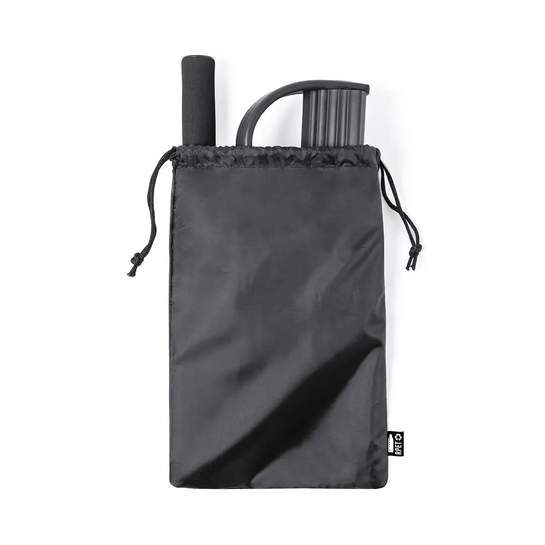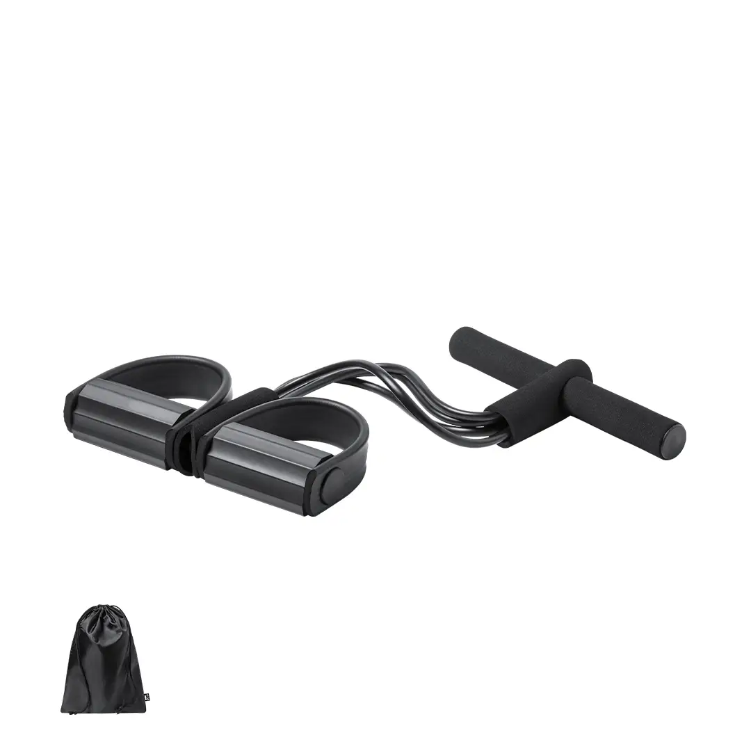 Cuerda de tensión para mantenerse en forma al aire libre o desde casa, diseñada para realizar una gran variedad de ejercicios. Fabricada en resistente combinación de ABS y EVA con asas ergonómicas acolchadas en espuma y soportes para pies recubiertos en EVA, con calapiés de seguridad. De resistencia media y con folleto de ejercicios. Presentada en funda a juego de poliéster RPET, elaborada a partir de plástico reciclado para así fomentar la reutilización de residuos plásticos y contribuir a la sostenibilidad del planeta. Etiqueta RPET distintiva en funda.