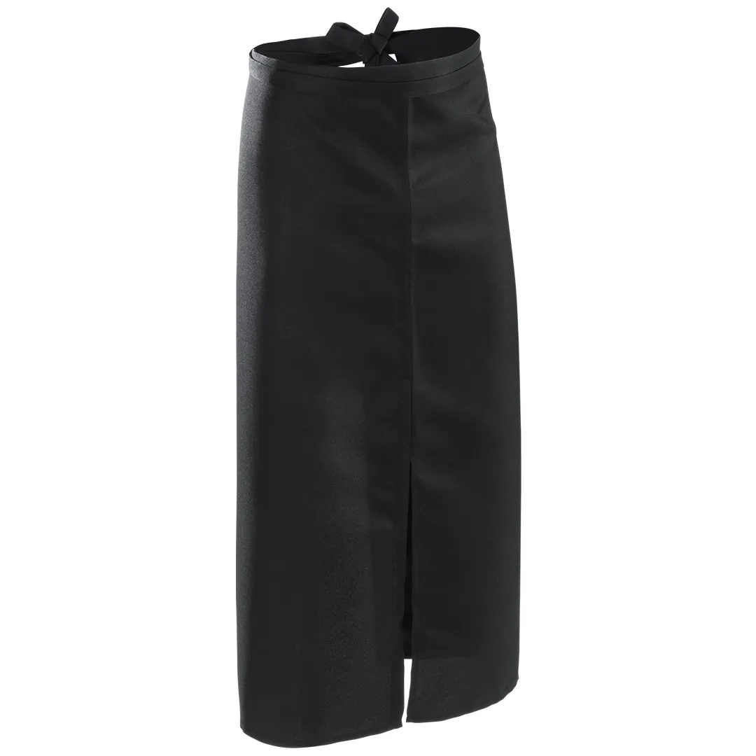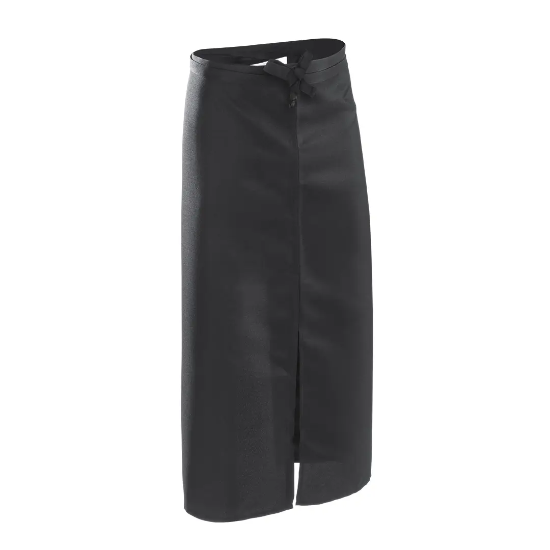 Delantal para cintura fabricado en resistente poliéster y en elegante color negro. De corte por debajo de la rodilla y con cintas de ajuste.