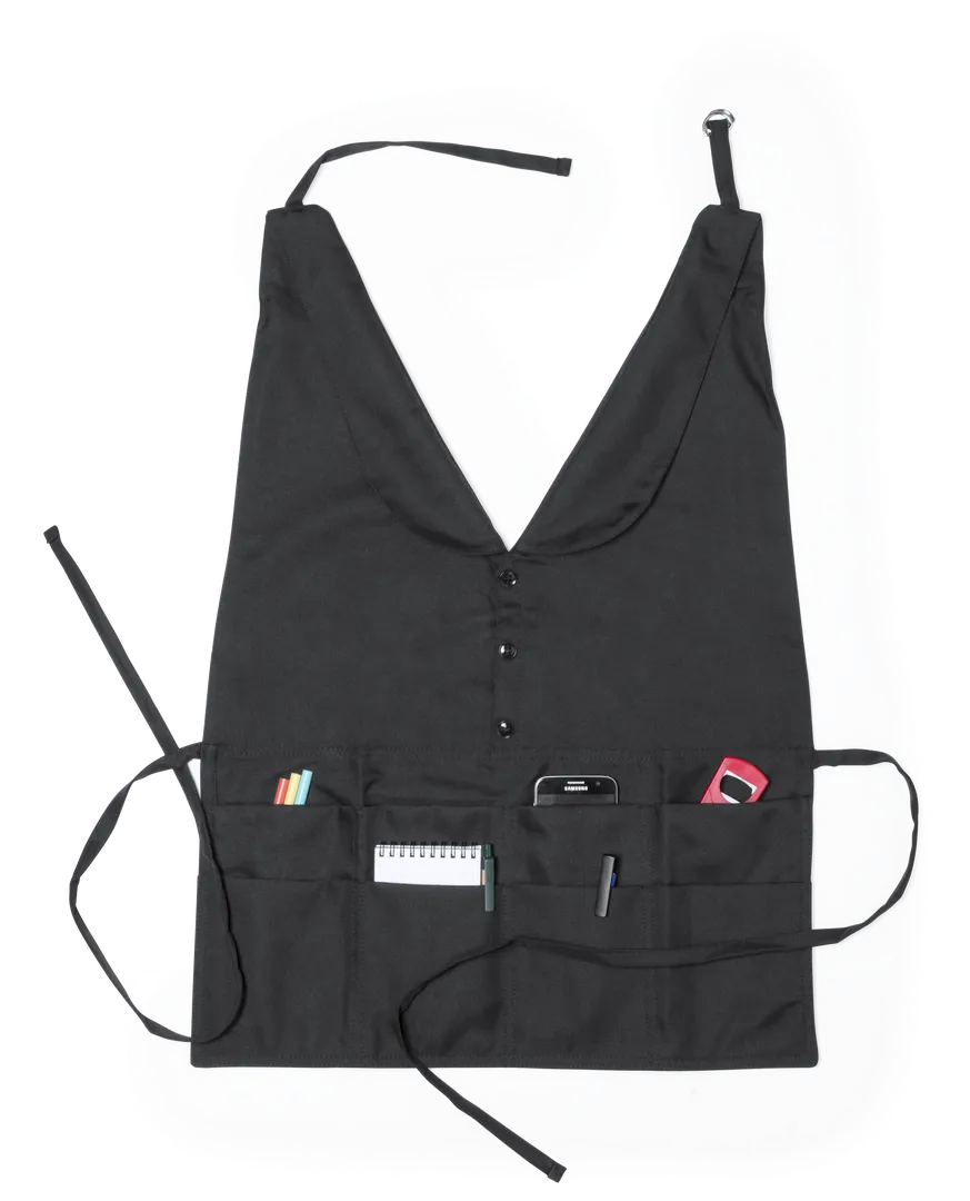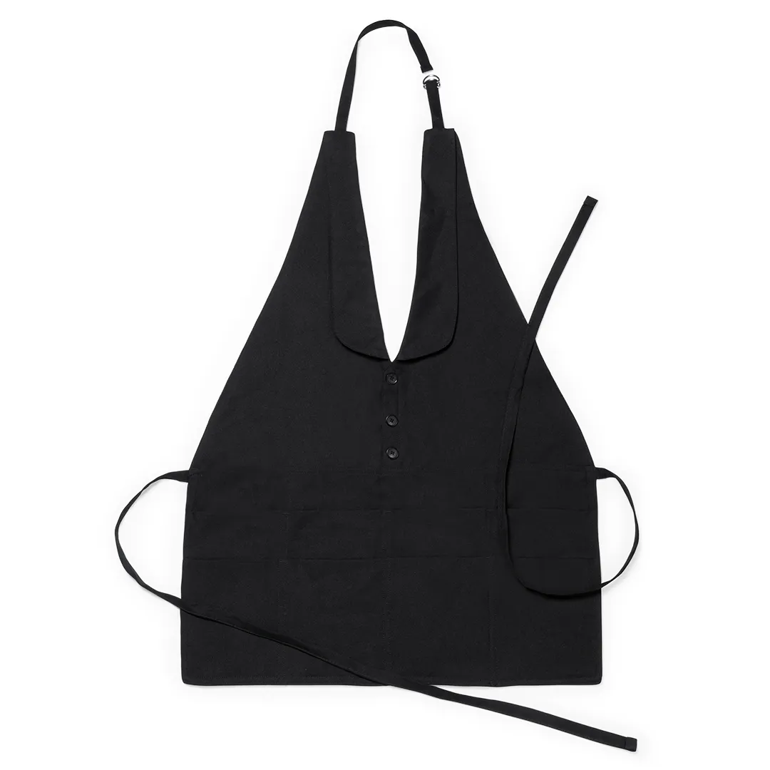 Elegante delantal con adorno de botones en material 100% poliéster. Con cinta para cuello ajustable y cintas para cintura.