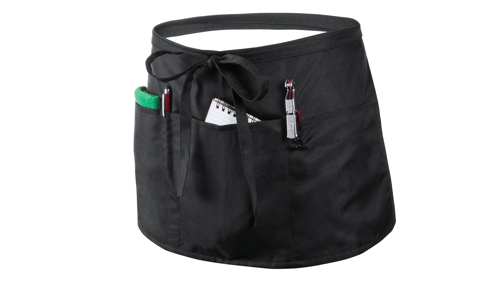 Delantal para cintura en material 100% poliéster de suave acabado en elegante color negro. Con 2 bolsillos grandes, bolsillo mediano y funda par bolígrafo. Ajustable mediante cintas.