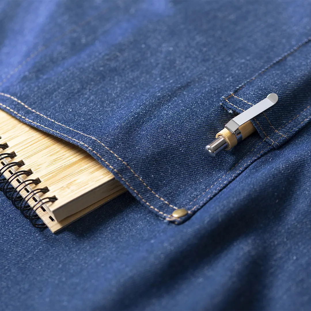 Delantal de alta calidad en resistente tela de acabado denim. De corte por debajo de la rodilla, con cinta de cuello ajustable por botón, cintas para la cintura en color marrón, reforzadas. Incluye multitud de bolsillos para llevar cómodamente los distintos utensilios, con costuras reforzadas y remaches metálicos.
