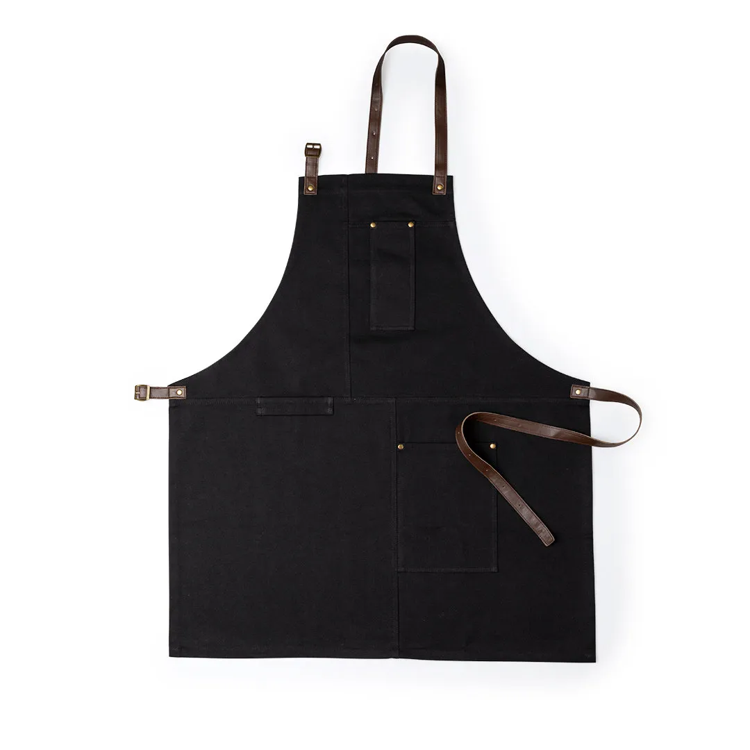 Delantal pro de alta calidad en resistente material 100% algodón canvas de 340g/m2. De corte por debajo de la rodilla, con cintas de cuello y cintura en resistente polipiel con ajuste mediante hebilla y reforzado con remaches metálicos. Incluye multitud de bolsillos para los distintos utensilios, con las costuras reforzadas.