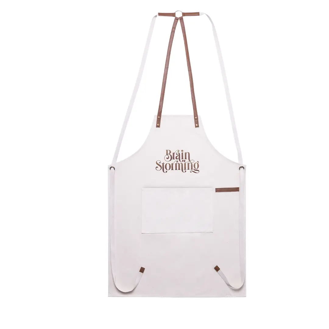 Delantal de alta calidad en resistente material 100% algodón canvas de 340g/m2, con costuras reforzadas. De corte por debajo de la rodilla, con cintas en resistente polipiel y triple ajuste: cuello, espalda y cintura. Con bolsillo frontal, accesorio en polipiel y remaches metálicos de refuerzo.