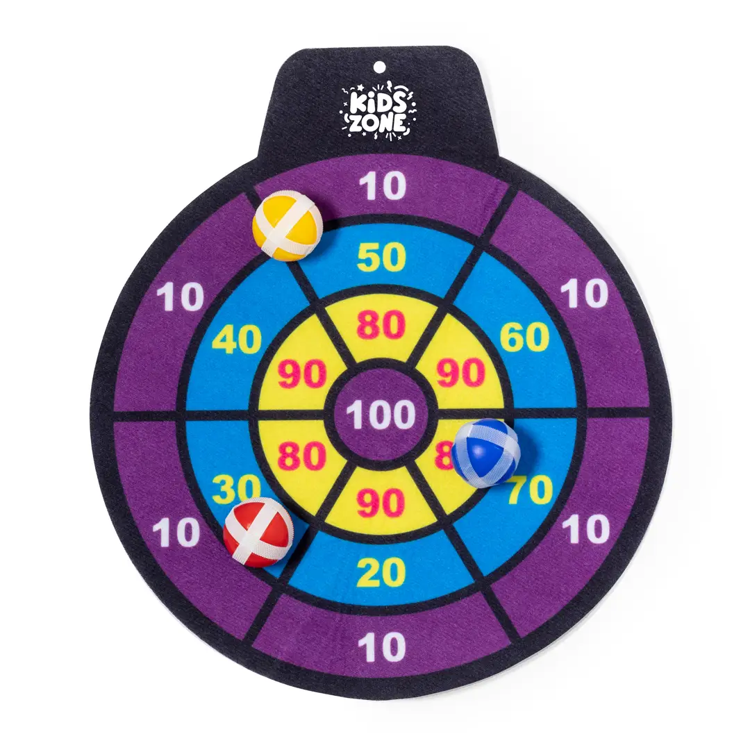 Divertida diana de tela con pelotas de velcro. Perfecta para todas las edades ofreciendo un objetivo desafiante y seguro. El juego consiste en lanzar a la diana con puntuaciónes las pelotas de distintos colores, que se quedarán fijas gracias a su envoltura de velcro. Fácil de colgar en cualquier sitio y a cualquier altura mediante agujero. Incluye diana de tela flexible y 3 pelotas con velcro. Presentado en bolsa reciclada.