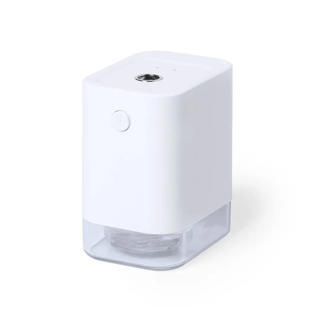 Dispensador automático de alcohol para higiene y limpieza de la piel, con sensor de movimiento de infrarrojos y led indicador. Tamaño compacto y discreto acabado en color blanco mate especialmente indicado para marcaje en tampografía, con depósito de 45 ml fácilmente rellenable (alcohol no incluido), más filtro y muelle de recambio. Batería de iones de litio de 1.800 mA y capacidad de conversión electrónica ≥ 90%. Recargable mediante cable USB tipo C de 1 metro de largo en color a juego,. Presentado en atractiva caja de diseño, disponible manual de instrucciones en español en inglés.