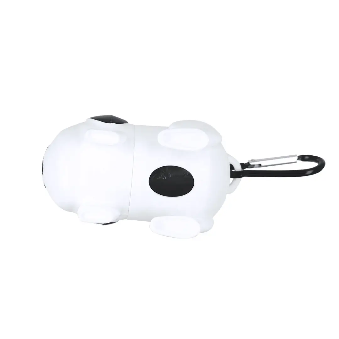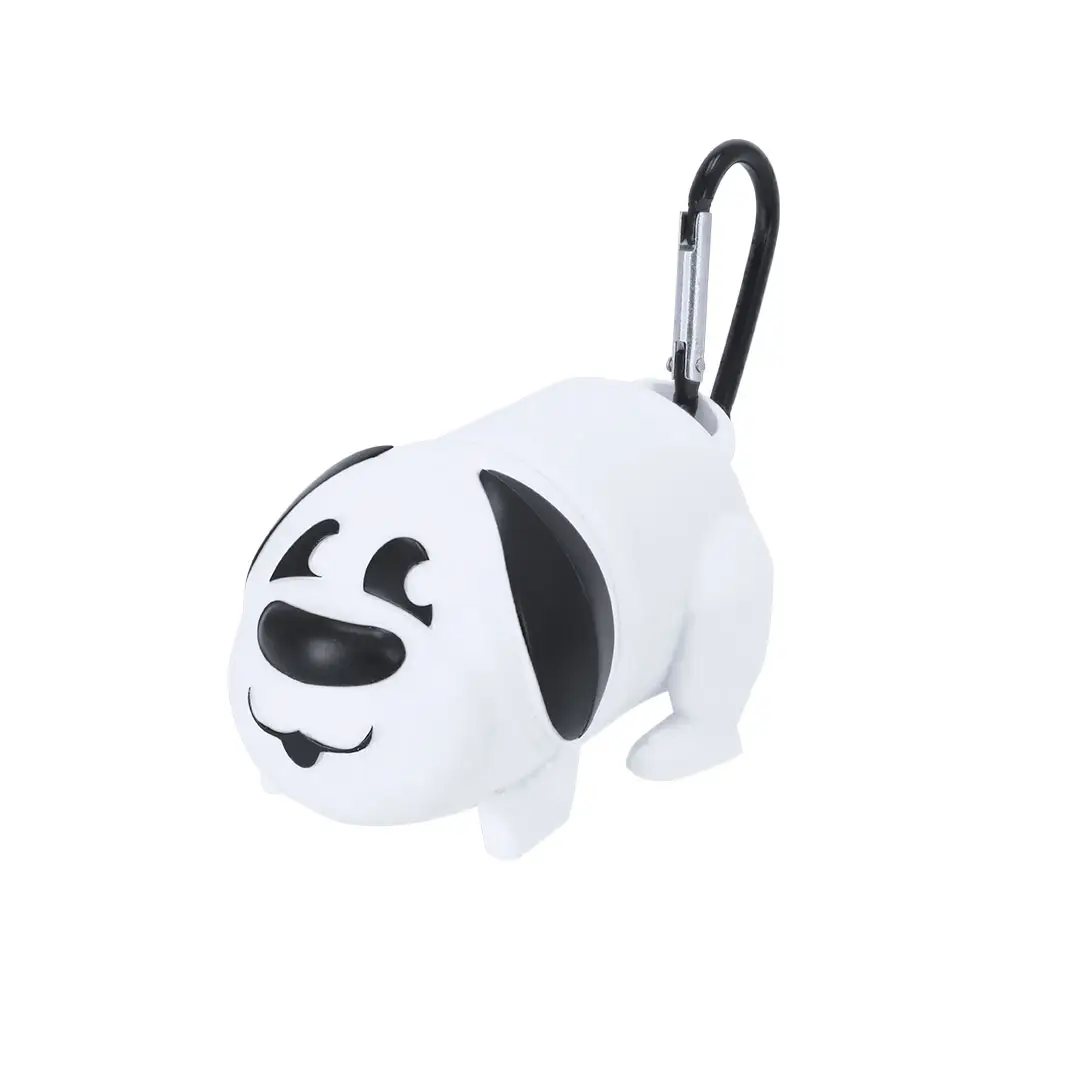 Dispensador de bolsas para mascotas con original diseño en forma de perro. Cuenta con mosquetón de transporte. Incluye 15 bolsas.