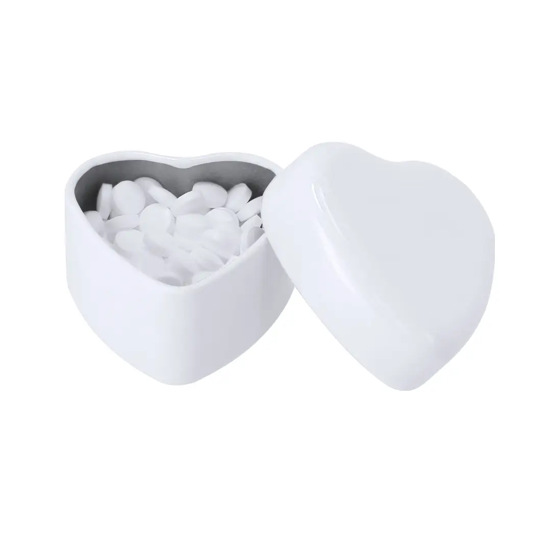Dispensador de caramelos de menta sin azúcar de 20 gr. En caja de metal con original forma de corazón.